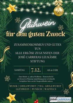 Unter dem Motto „Glühwein für den guten Zweck – Zusammenkommen und Gutes tun“ organisierte Jonathan Schmid in Weilheim – Remetschwiel ein gemütliches vorweihnachtliches Beisammensein. Für das leibliche Wohl war bestens gesorgt und die Musik sorgte für die richtige Stimmung. Dass die Erlöse aus diesem Adventssamstag an die José Carreras Leukämie Stiftung gingen, fanden alle Besucher eine schöne Idee. Wir sagen danke für knapp 900 Euro und die treue Verbundenheit von Jonathan Schmid.