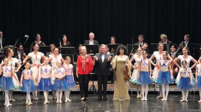 Kurorchester Bad Füssing im Hintergrund (Leitung Anna Fuhrländer, Mitte rechts), Ballettensemble Eggenfelden im Vordergrund (Leitung Helga Hemala-Fischer, Mitte links), Moderator Norbert Stapfer (Mitte), Bad Füssing, Januar 2025