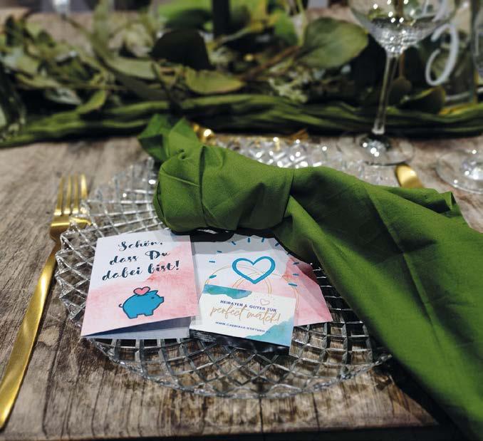 Unsere Gastgeschenke. Sprich, statt aufwendige Give Aways bekommen Hochzeitsgäste eine kleine Aufmerksamkeit: ein personalisiertes Andenken, das zugleich als schönes Detail der Tischdekoration dient. Konkret handelt es sich bei uns um eine nette Karte und eine Streichholzschachtel mit der Botschaft „Heiraten & Gutes tun – Perfect Match!”. Die Karte ist mit dem Datum der Hochzeit und den Namen des Brautpaares personalisiert.