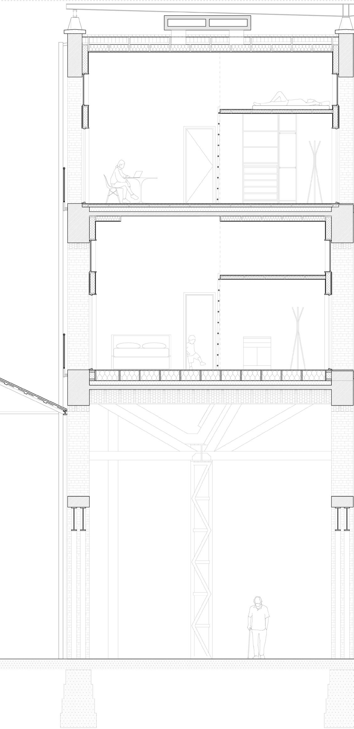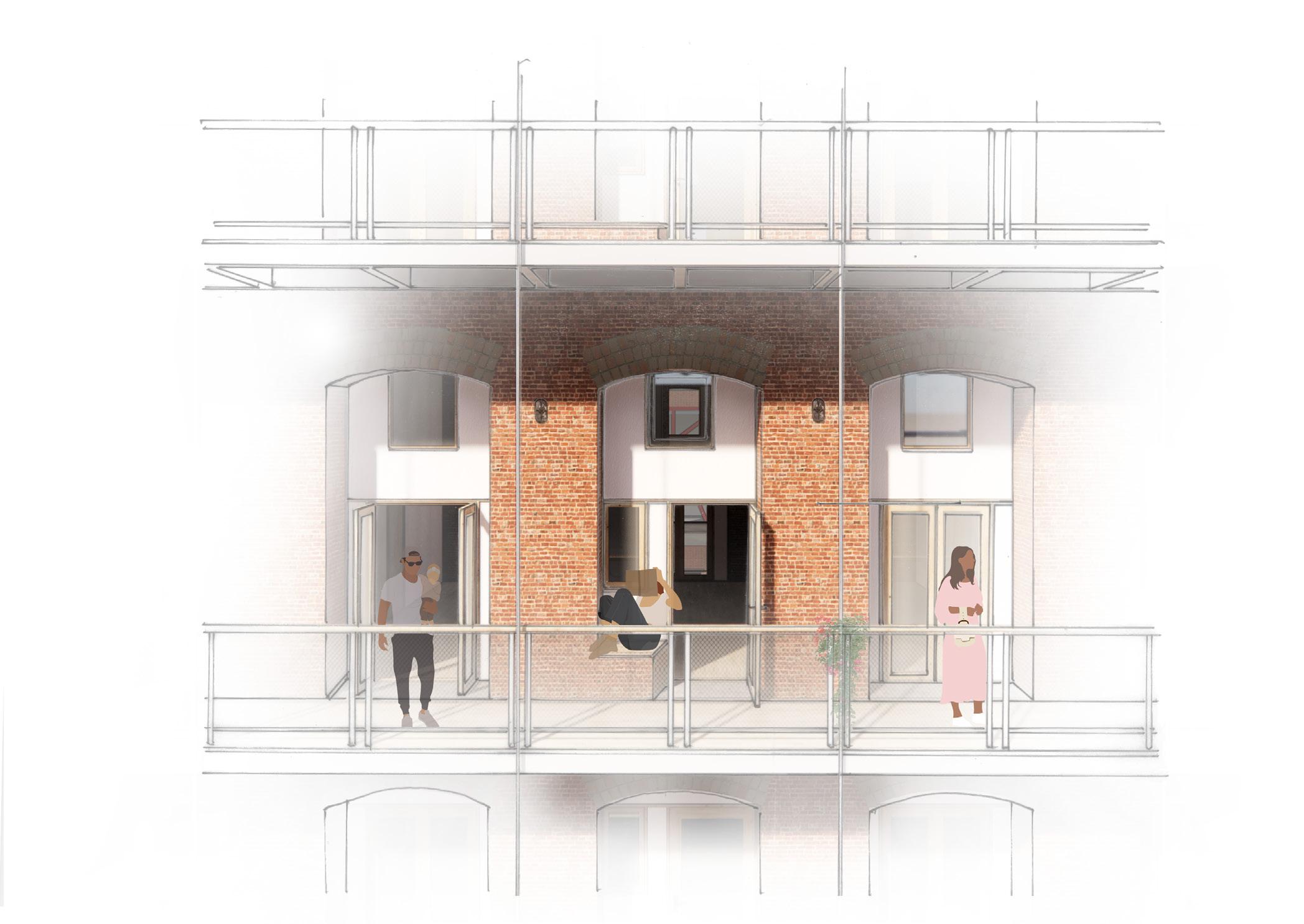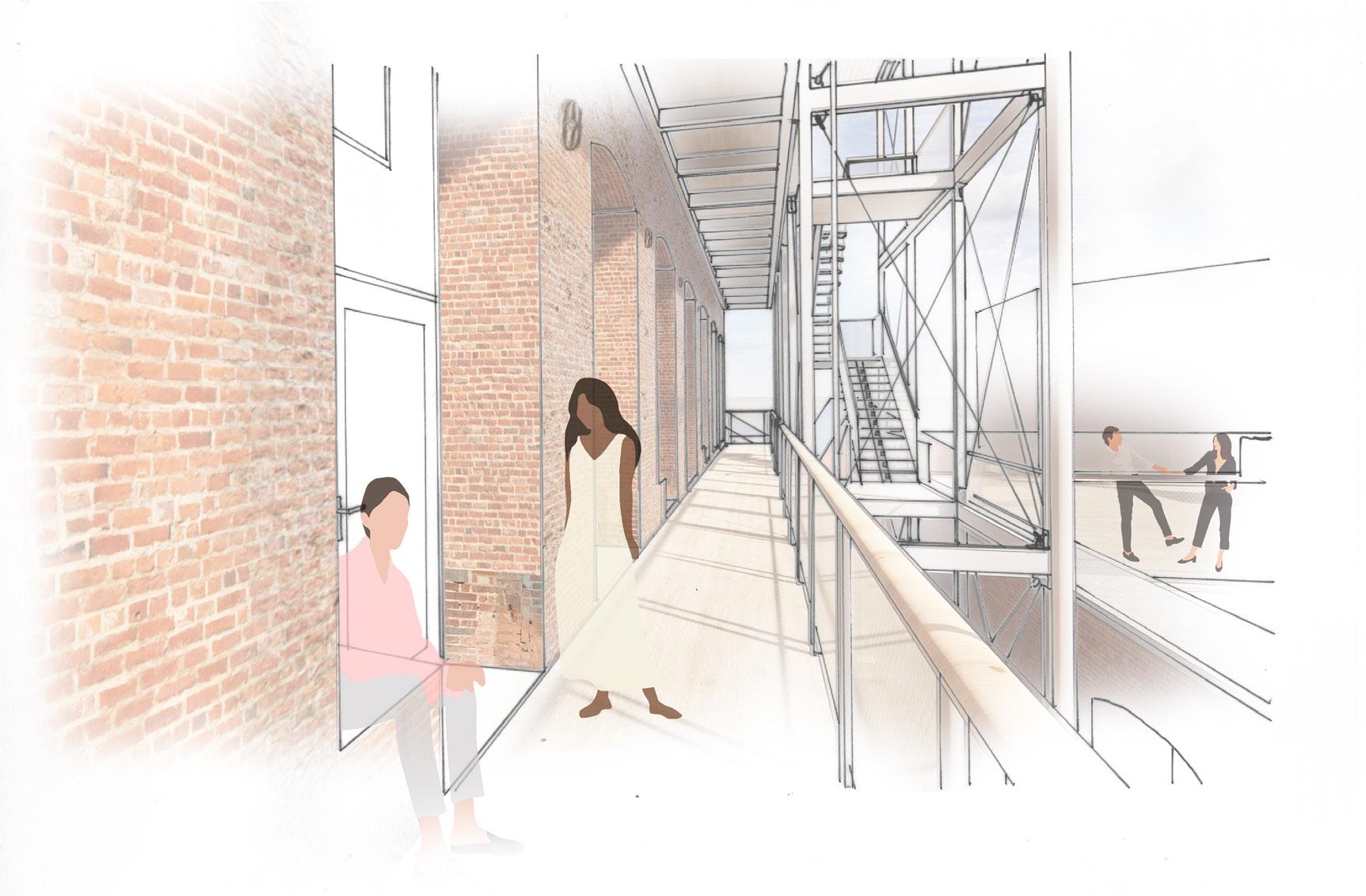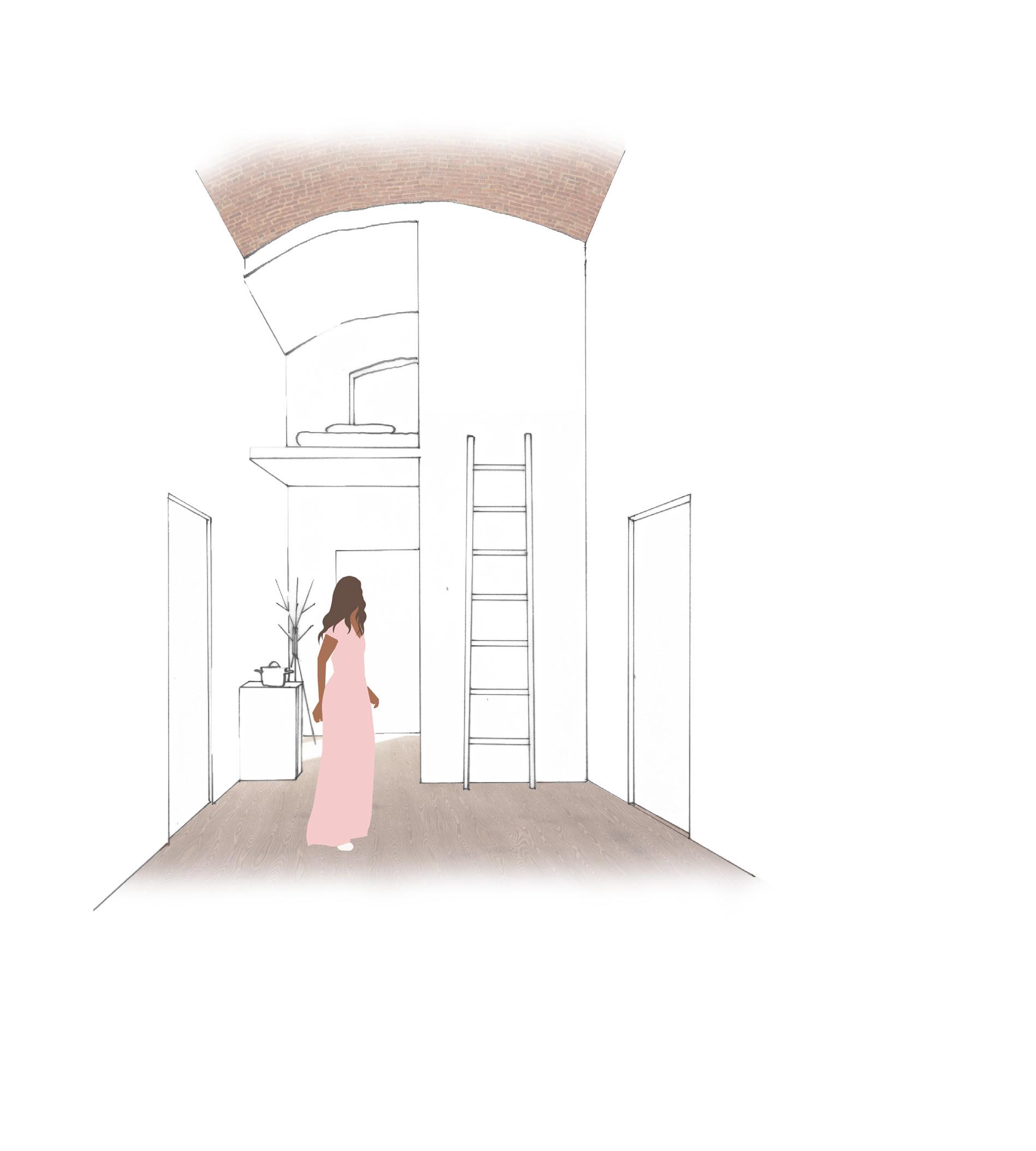 Flexibility and community The building that I chose to develop in further architectural detail is the narrow strip covering the passage towards the Meuse. The building mass above the passage consists of two floors covered with Prussian vault ceilings. The design is tailored for the highly mobile international community of Maastricht, which requires high flexibility. In order to allow the entire vaulted space to be inhabited, galleries are suspended next to the building itself. The apartments are accessed through enlarged openings in the wall, whose thickness allows for a small transition space from the gallery which can be personalized by the inhabitant of each apartment. Inside, the apartment presents itself as a classic hotel room, perfect for the short stay dweller, which can be extended to either side with optional extra space. In the detailing, the emphasis is put on the contrast between the age, the weight and the texture of the existing brick walls and the new additions made from lightweight steel and timber.