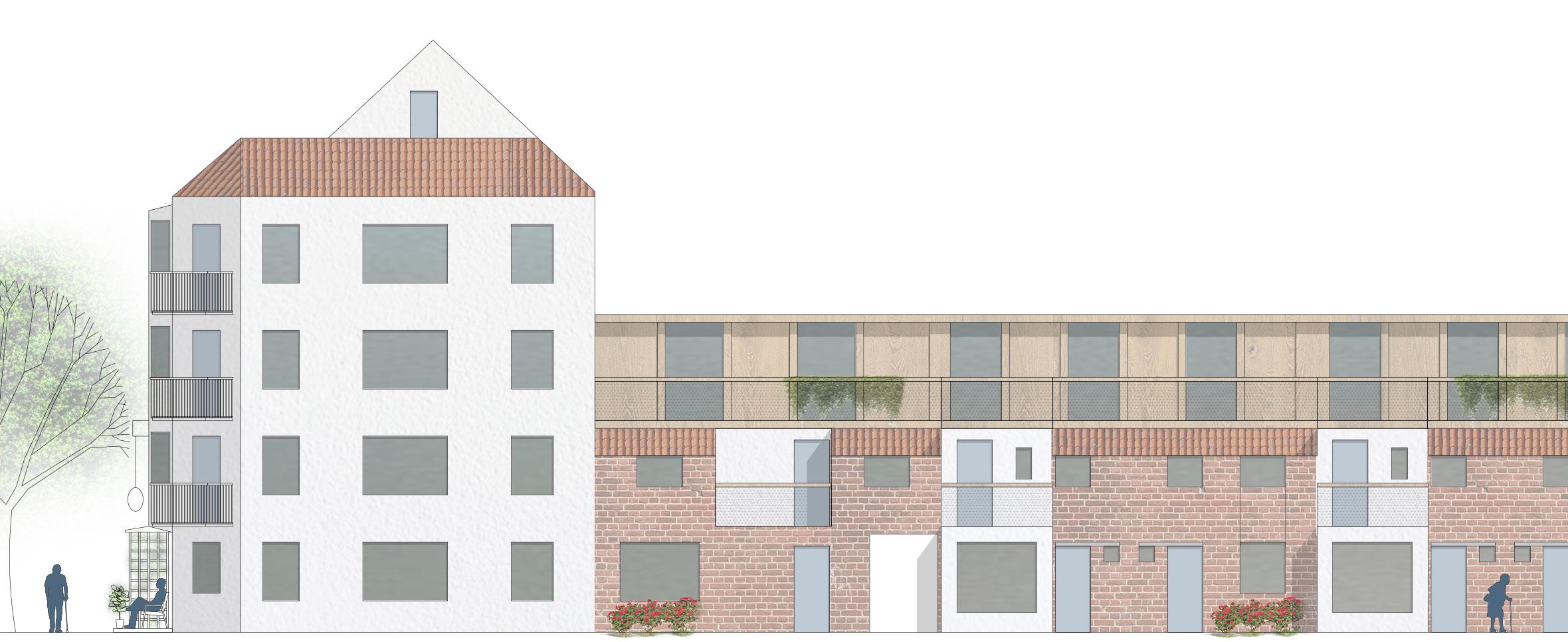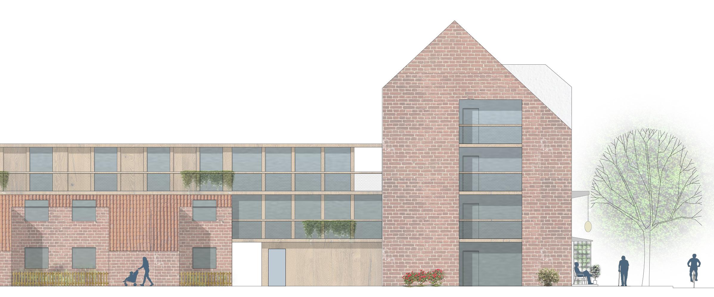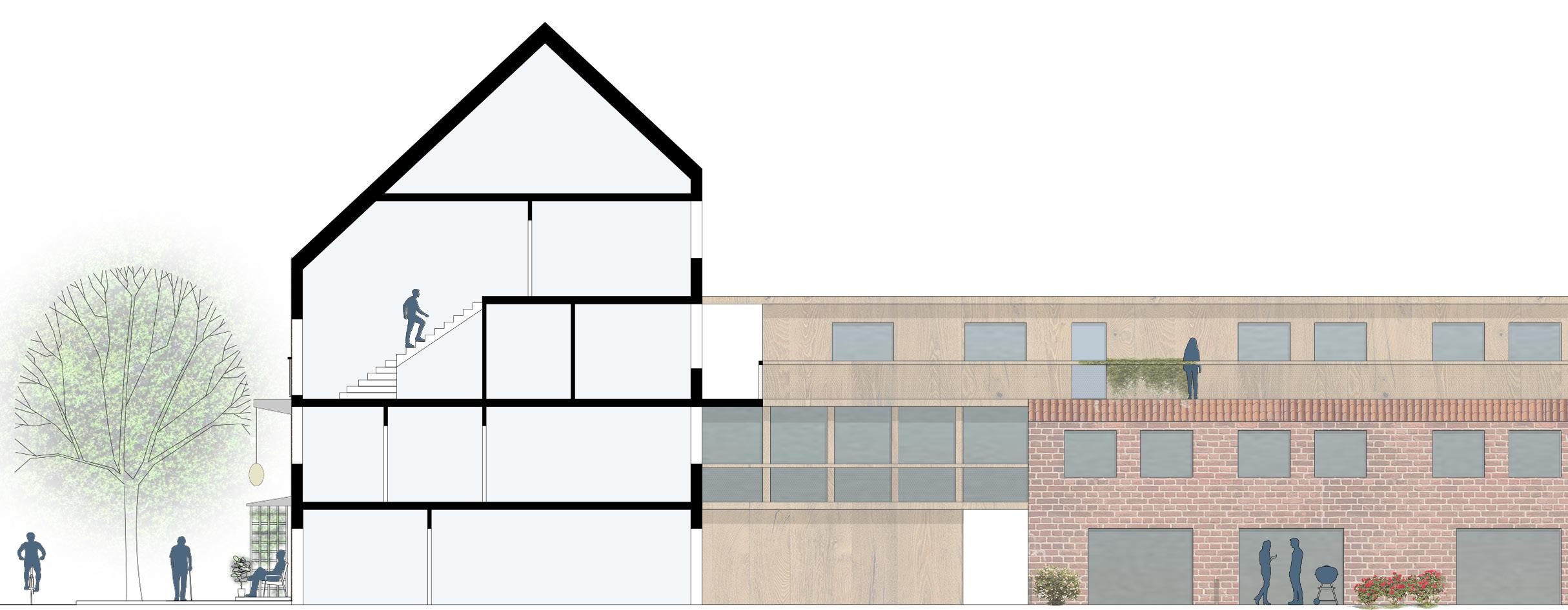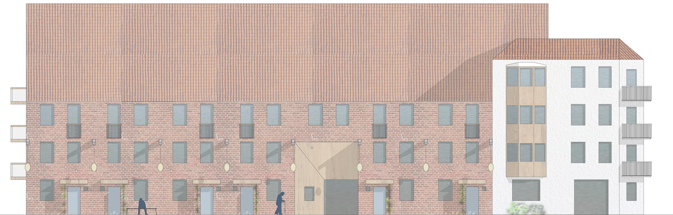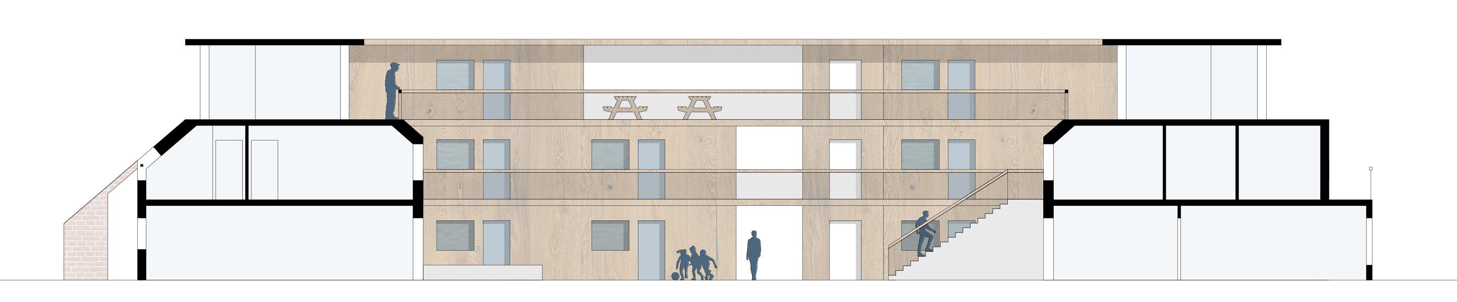original concrete structure from the 1980s can be reused almost entirely. In order to densify the block, a gallery is added on top of the rowhouses, allowing for an extras story of lightweight single story apartments. The north-western corner of the block which currently has poor access to natural light is replaced by a four story addition. In the south, a new wing is added, facing the park. The new additions are made using wood and white plaster finishing, contrasting with concrete and brick palette of the existing architecture.