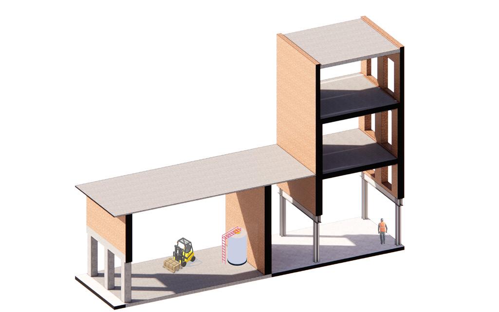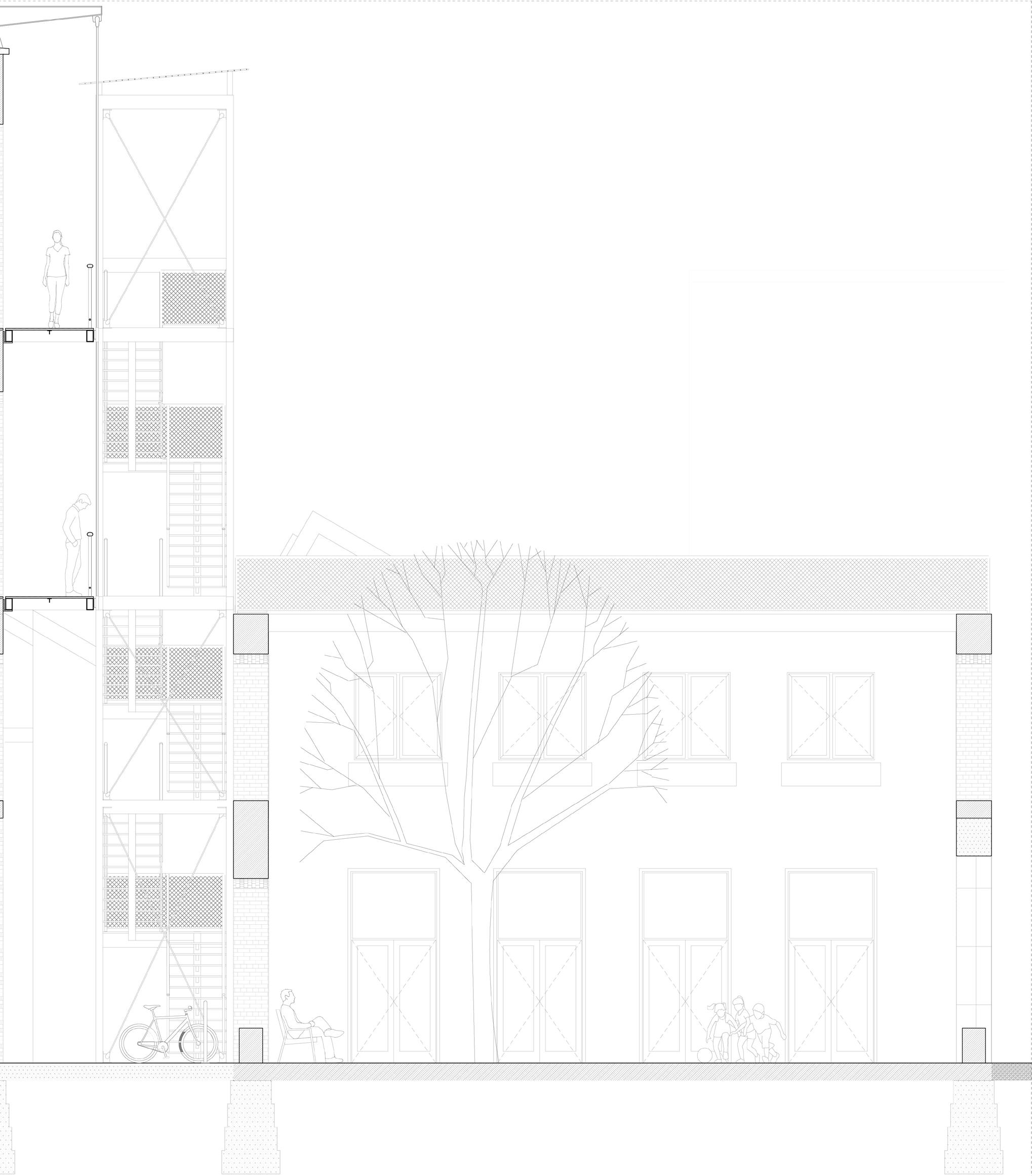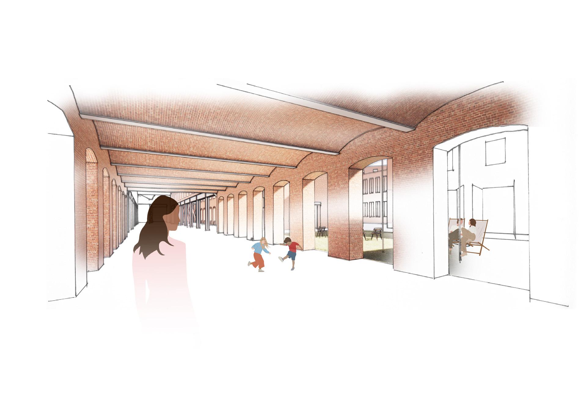 The architectural tool that is use for this is carving the mass of the factory, in order to make the richness of the walls available for the collective, and allow for new memories and traces to build The porosity of the walls organizes the space by indicating transitions from public to private.