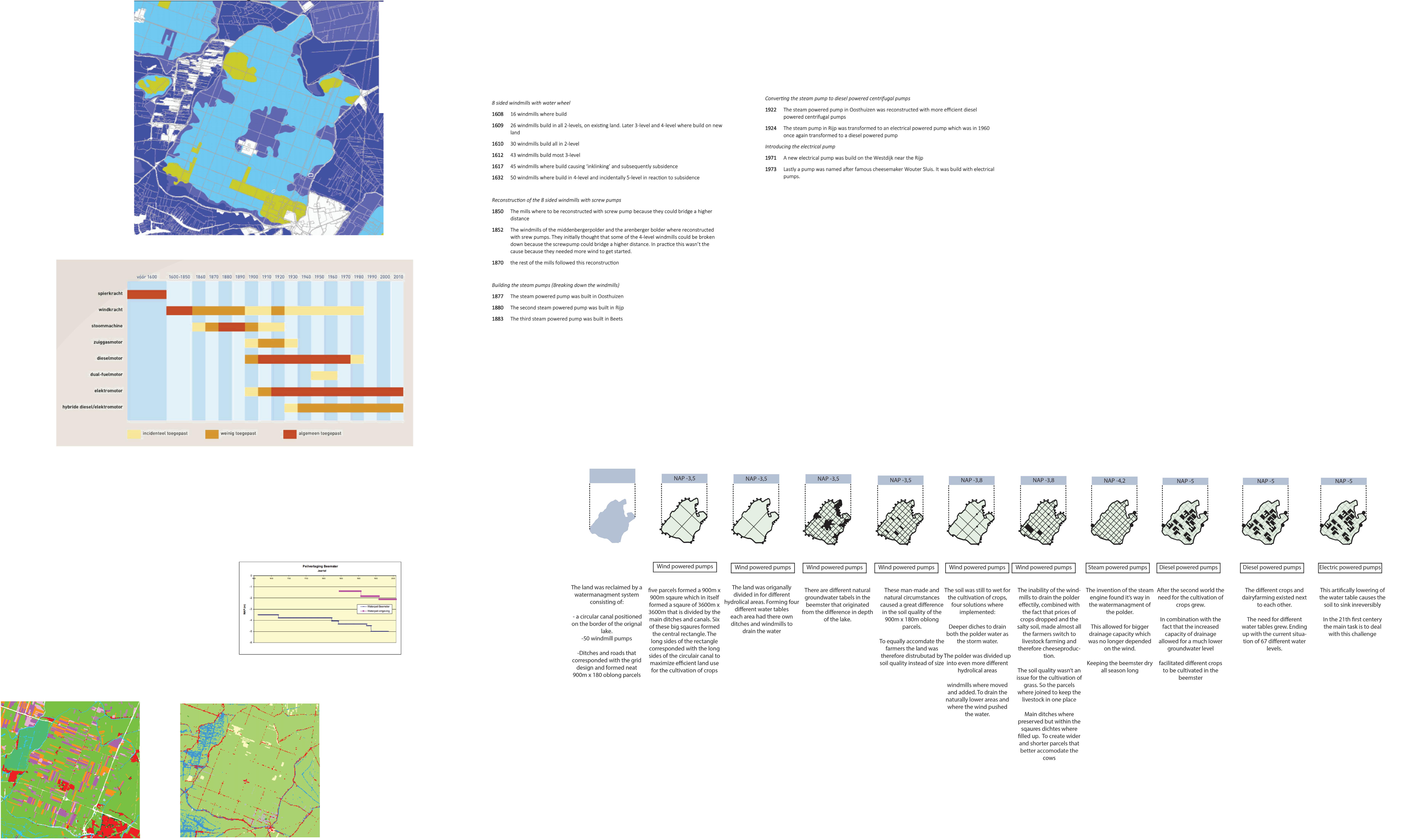Beemster - Kaasproductie in de anthropoceen43 1612: The reclemation of the lake by systemwatermanagmentaconstisting of: a ring canal, 50 windmills and a grid of moats. Ca 1600: The Beemster lake Ca 1000: Exploatiation of the wetlands 1643: Natural water tables 1660: Reorganisation and refinement of the watertables and milling system. 1700: Transition from horticulture to dairy farming 1850: Introduction of steam monthsthewaterpumps,poweredallowingpoldertobedry12ayear. 1950: Water tables are lowered due to a national food crisis. 1970: Artificially low water toubles cause increased subsidence. 2000: Dynamic water tables further allow further flexibility.farming Section through time 1643: Land division according to soil quality 1612: Idealised layout according to roman principles of cardo and decumanus 20 1 m