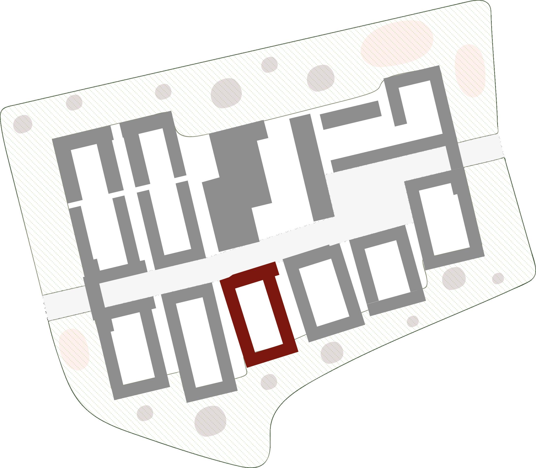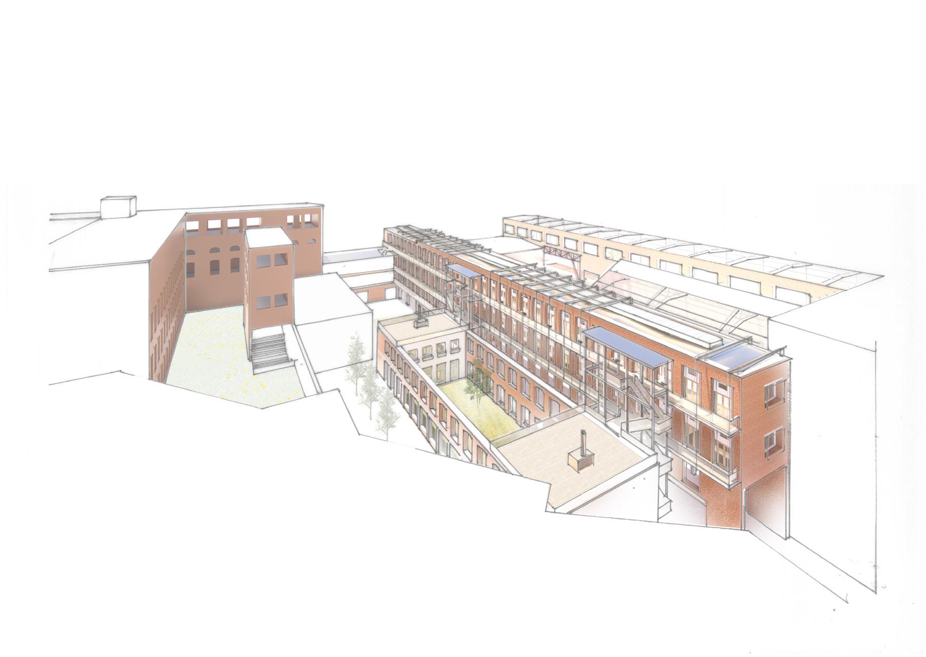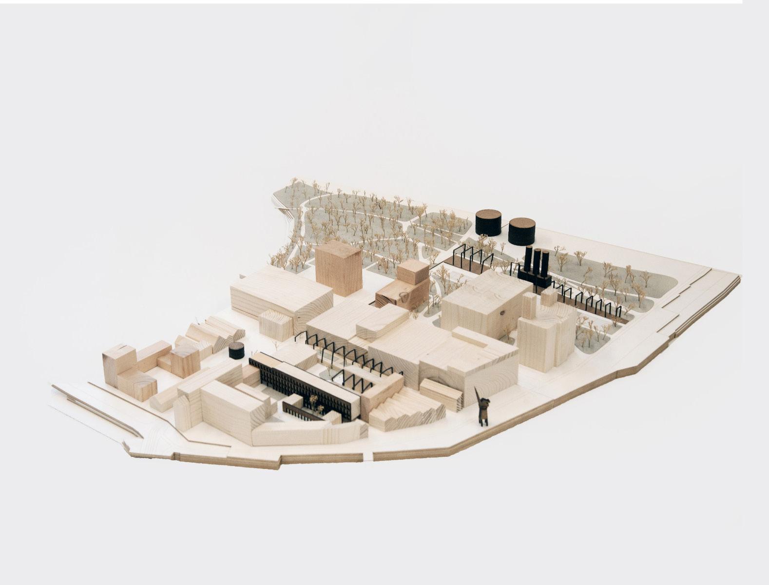The design of the masterplan puts its focus on integrating into the structure that was inherited, and giving it new meaning. By transforming the northern factory into a park and opening up a disused railway bridge for pedestrians and cyclists, we reconnect the ring, creating an uninterrupted 2.5 kilometer park. The southern factory is dominated by a large monolithic superblock. Its morphology is strongly related to the city wall, from which layers grew towards the south and the north. In the new design, the superblock needs to be made accessible. We chose to do so by placing the circulation through the block in two prominent buildings, which emphasize the direction which is already present in the existing structure. I chose to elaborate the design of the southernmost and oldest part of the block, which crucially contains one of the passages. The railway line is opened up for the public