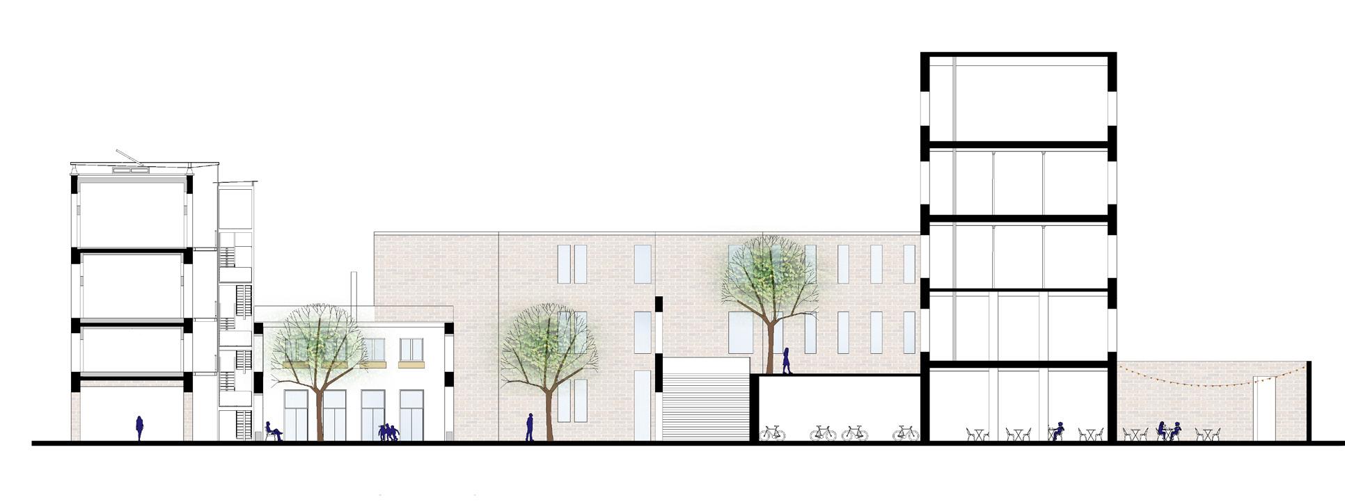 The idea of the project speaks the most clearly from a section cutting through the ribbons. The walls of the factory, with their rich layers and textures emerge as the silent witnesses of the past. Everyday life happens in-between. The design celebrates the incremental growth of the factory and activates it by introducing sunlight and activity between the walls. It is at this intersection between the long developments of buildings through time