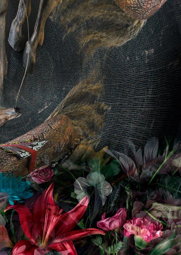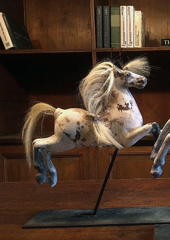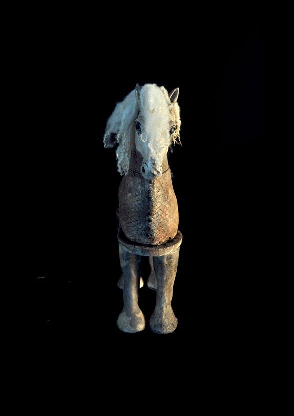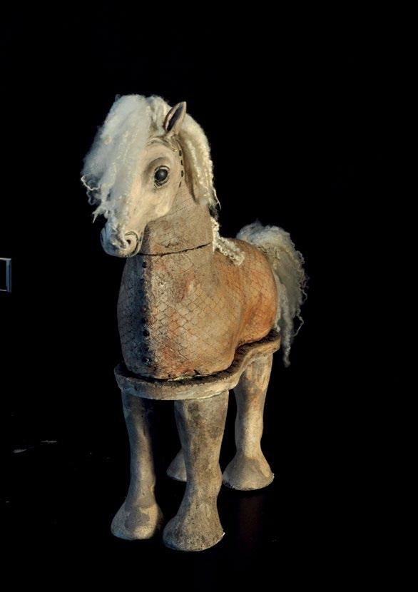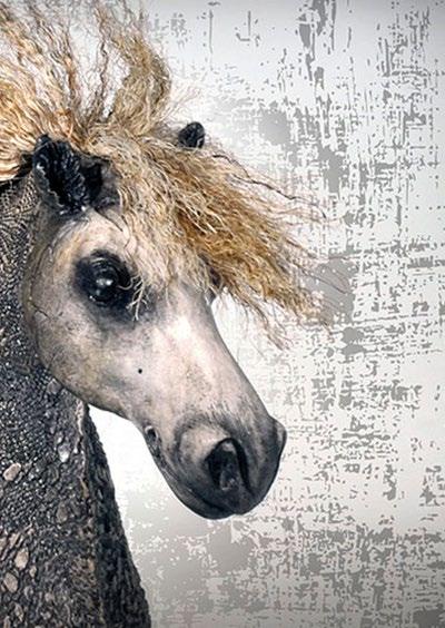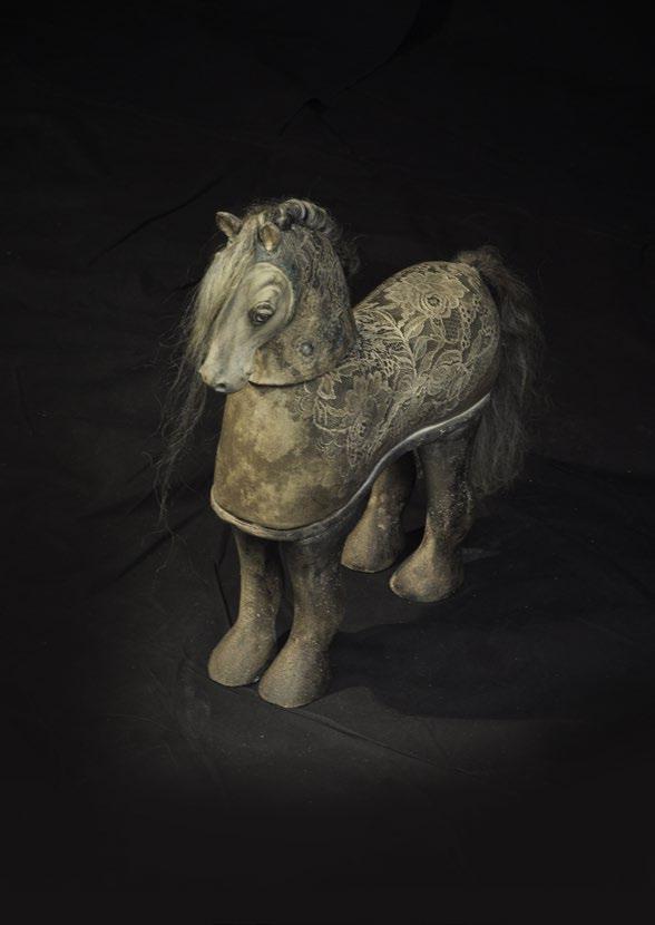A fairground horse with a blue-green mane made of sheep’s wool and a lace-printed coat in blue touches, christened ‘Blu’. Next to ‘Blu’ is the mare ‘Valentine’, with a real Lipizzan mane and black legs up to the knee as if she were wearing stockings.