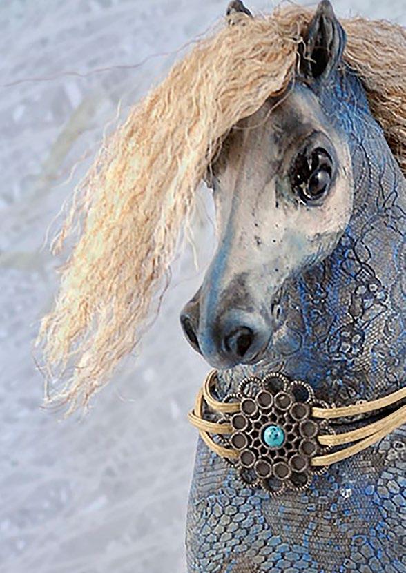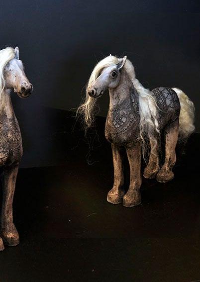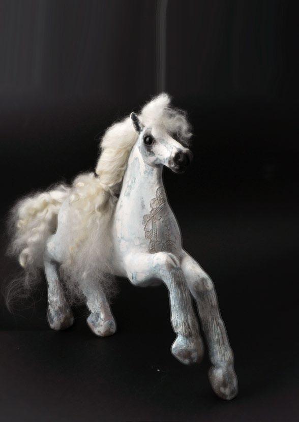 Een kermispaard met appelblauwzeegroene manen van schapenwol en een vacht met kantprint in blauwe toetsen, ‘Blu’ gedoopt. Naast ‘Blu’ de merrie ‘Valentine’, met echte Lipizzanermanen en zwarte poten tot de knie alsof ze kousen draagt.