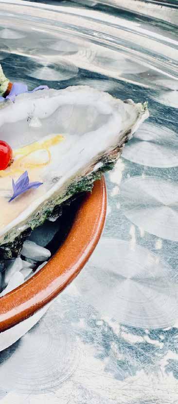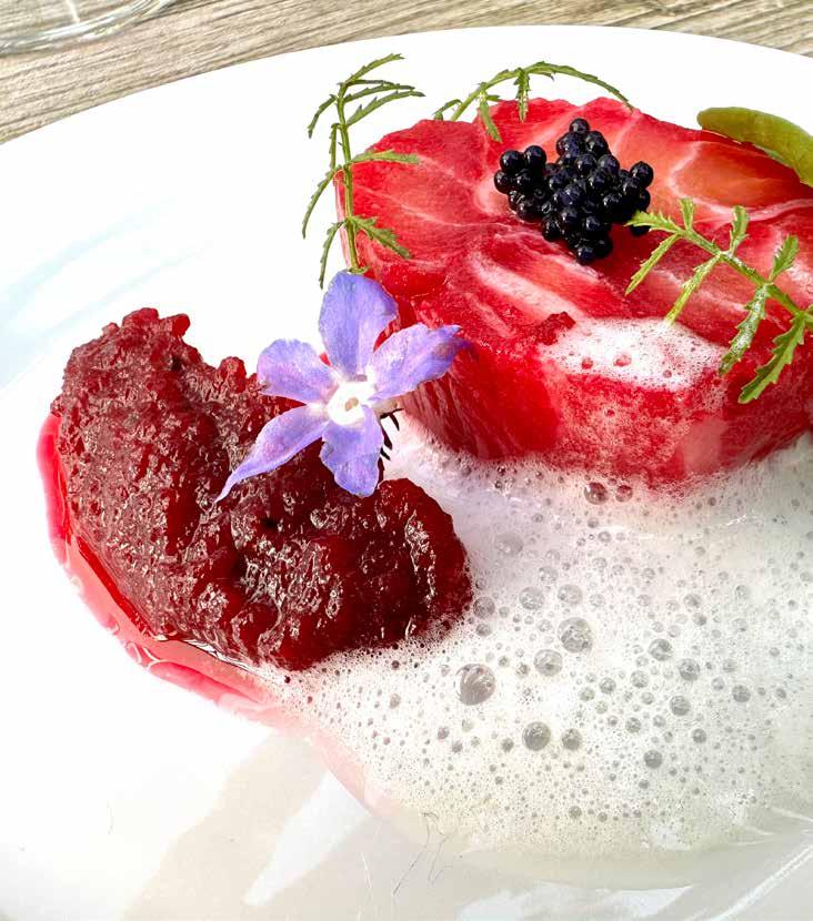 • • • • Salmon and caviar with beetroot tartare and lime foam
