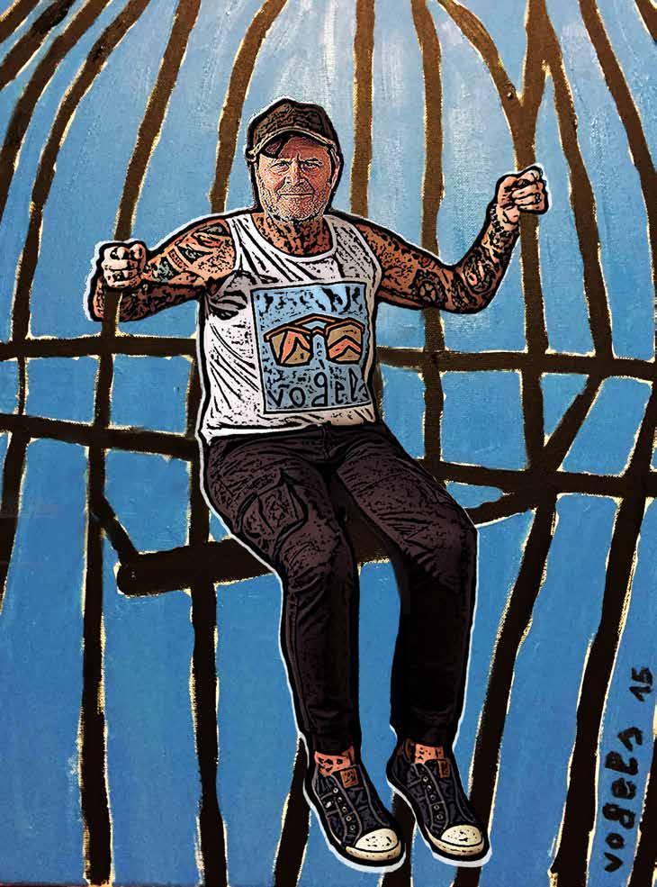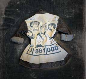 • • • • Barista David wears a jeans vest patchworked with a recycled coffee bag