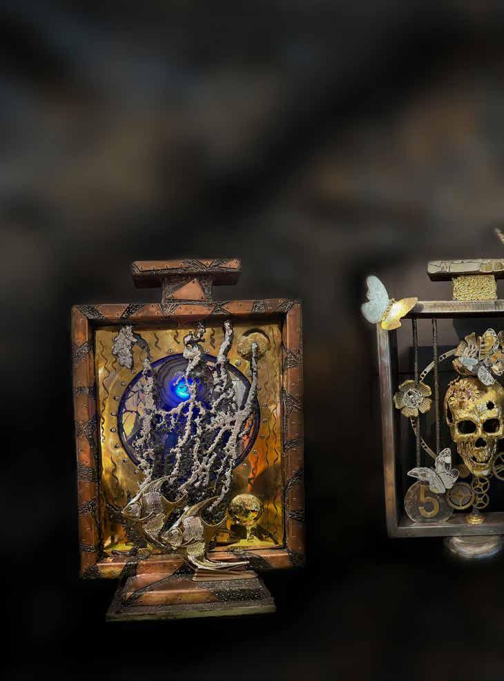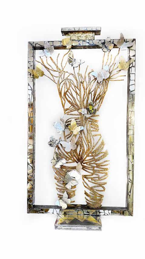 Naargelang de lichtinval in het interieur, verandert het sculptuur van kleurintensiteit door de gebruikte materialen: licht weerkaatsende metalen, spiegelscherven en de afwerking met bladgoud.