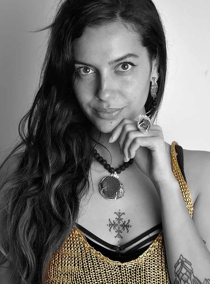 Lavastenen zijn misschien niet waaraan je denkt bij een modieuze juwelenset. Deze ring, oorbellen en hangar in zilver krijgen er een hoog rock-’nrollgehalte door. Of is het omdat ons model Laura verrassend veel wegheeft van Amy Winehouse?