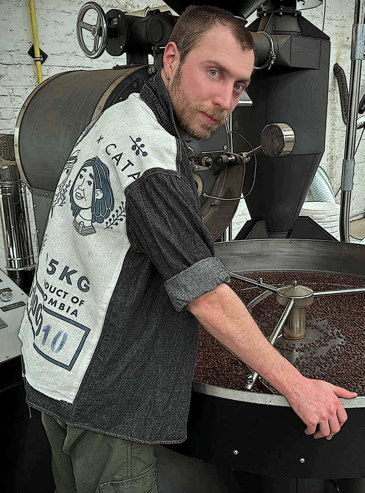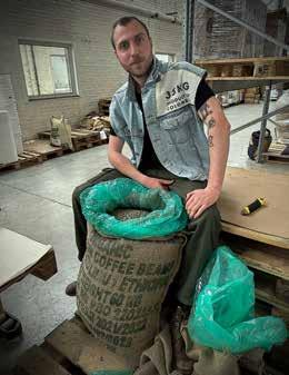 • • • • Barista David wears a jeans shirt with a recycled coffee bag insert on the back.