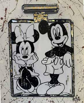 Christine Beys, aka ANJUNI, born in the French town of Poissy (1966) runs an antiques shop on Rue Blaes in Brussels. Among her artful and tastefully chosen trinkets - jewellery, design artefacts, furniture pieces - her own creations, oil paintings set with gold and silver leaf, mirror shards and mosaic pieces. At the centre of her works is the legendary Chanel bottle.