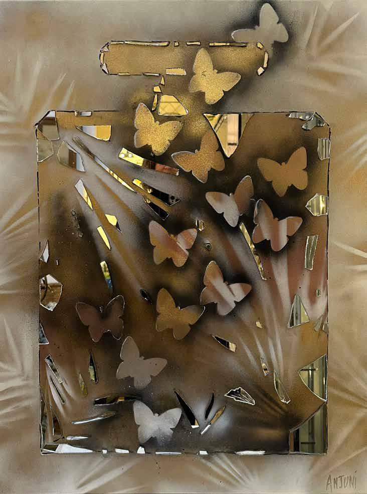 Christine Beys, alias ANJUNI, geboren in het Franse stadje Poissy (1966) baat een antiekzaak uit in de Blaesstraat te Brussel. Tussen haar kunstzinnige en met smaak gekozen snuisterijen - juwelen, design artefacten, meubelstukken - haar eigen creaties, olieverfschilderijen bezet met bladgoud en -zilver, spiegelscherven en mozaïekstukjes. In haar werken staat het legendarische Chanelflesje centraal.