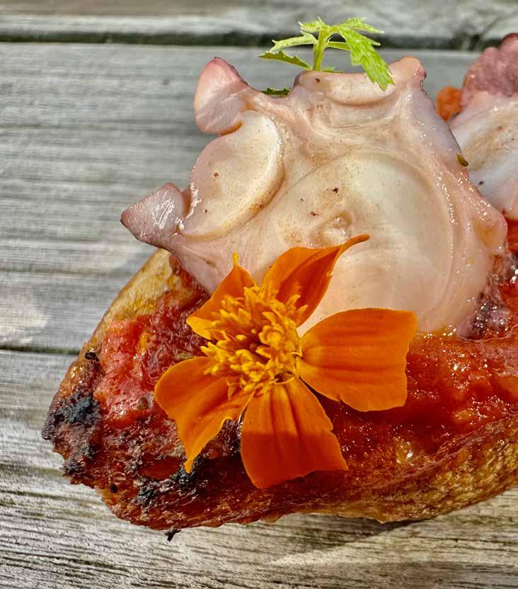 • • Apetiser like the traditional Spanish pan con tomate, but on sourdough toast, with mini-octopus and eatable flowers