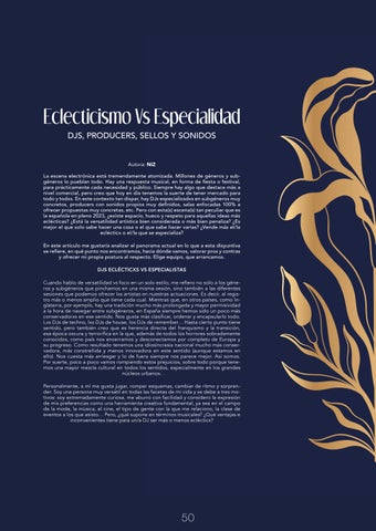 Eclecticismo Vs Especialidad DJS, PRODUCERS, SELLOS Y SONIDOS Autora: NiZ La escena electrónica está tremendamente atomizada. Millones de géneros y subgéneros lo pueblan todo. Hay una respuesta musical, en forma de fiesta o festival, para prácticamente cada necesidad y público. Siempre hay algo que destaca más a nivel comercial, pero creo que hoy en día tenemos la suerte de tener mercado para todo y todxs. En este contexto tan dispar, hay DJs especializadxs en subgéneros muy concretos, producers con sonidos propios muy definidos, salas enfocadas 100% a ofrecer propuestas muy concretas, etc. Pero con esta(s) escena(s) tan peculiar que es la española en pleno 2023, ¿existe espacio, hueco y respeto para aquellas ideas más eclécticas? ¿Está la versatilidad artística bien considerada o más bien penaliza? ¿Es mejor el que solo sabe hacer una cosa o el que sabe hacer varias? ¿Vende más el/la eclécticx o el/la que se especializa? En este artículo me gustaría analizar el panorama actual en lo que a esta disyuntiva se refiere, en qué punto nos encontramos, hacia dónde vamos, valorar pros y contras y ofrecer mi propia postura al respecto. Elige equipo, que arrancamos. DJS ECLÉCTICXS VS ESPECIALISTAS Cuando hablo de versatilidad vs foco en un solo estilo, me refiero no solo a los géneros y subgéneros que pinchamos en una misma sesión, sino también a las diferentes sesiones que podemos ofrecer lxs artistas en nuestras actuaciones. Es decir, al registro más o menos amplio que tiene cada cual. Mientras que, en otros países, como Inglaterra, por ejemplo, hay una tradición mucho más prolongada y mayor permisividad a la hora de navegar entre subgéneros, en España siempre hemos sido un poco más conservadorxs en ese sentido. Nos gusta más clasificar, ordenar y encapsularlo todo. Lxs DJs de techno, lxs DJs de house, los DJs de remember… Hasta cierto punto tiene sentido, pero también creo que es herencia directa del franquismo y la transición, esa época oscura y terrorífica en la que, además de todos los horrores sobradamente conocidos, como país nos encerramos y desconectamos por completo de Europa y su progreso. Como resultado tenemos una idiosincrasia nacional mucho más conservadora, más constreñida y menos innovadora en este sentido (aunque estamos en ello). Nos cuesta más arriesgar y lo de fuera siempre nos parece mejor. Así somos. Por suerte, poco a poco vamos rompiendo estos prejuicios, sobre todo porque tenemos una mayor mezcla cultural en todos los sentidos, especialmente en los grandes núcleos urbanos. Personalmente, a mí me gusta jugar, romper esquemas, cambiar de ritmo y sorprender. Soy una persona muy versátil en todas las facetas de mi vida y se debe a tres motivos: soy extremadamente curiosa, me aburro con facilidad y considero la expresión de mis preferencias como una herramienta creativa fundamental, ya sea en el campo de la moda, la música, el cine, el tipo de gente con la que me relaciono, la clase de eventos a los que asisto… Pero, ¿qué supone en términos musicales? ¿Qué ventajas e inconvenientes tiene para un/a DJ ser más o menos eclécticx?