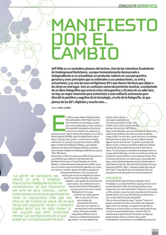 MANIFIESTO POR EL CAMBIO Jeff Mills es un verdadero pionero del techno. Uno de los miembros fundadores de Underground Resistance, aunque tremendamente desmarcado e independiente en la actualidad; un productor radical con una perspectiva genuina y unos principios que se extienden a sus producciones, su arte y actuaciones; y es uno de esos vertiginosos DJ’s que tienen técnicas que dejan a los otros en mal lugar. Con un suntuoso nuevo lanzamiento musical, acompañado de un libro fotográfico que echa la vista retrospectiva a 20 años de su sello Axis, no hay un mejor momento para entrevistar a este solitario astronauta para discutir lo positivo y negativo de la tecnología, el arte de la fotografía, lo que piensa de los DJ’s digitales y mucho más…