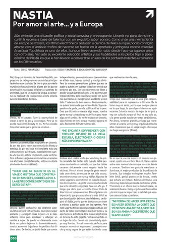 Por amor al arte... y a Europa Aún viviendo una situación política y social convulsa y preocupante, Ucrania no para de nutrir y curtir la escena a base de talentos con un exquisito sabor sonoro. Como si de una herramienta de escape se tratara, los ritmos electrónicos seducen a cientos de fieles aunque pocos consigan alzarse con el ansiado trofeo de hacerse un hueco en la apretada y jeringada escena mundial. Anastasia Topolskaia es uno de ellos. Aunque lleve haciendo ruido desde hace ya algunos años con otro alias, han sido su excelente selección artística y sus habilidades a los platos bajo el pseudónimo de Nastia los que le han llevado a convertirse en uno de los portaestandartes ucranianos de los últimos años. Texto: DIEGO FERNÁNDEZ Traducción: DIEGO FERNÁNDEZ & EDUARDO PÉREZ WASSDORP Fiel, fija y casi sinónimo de Kazantip Republik, con programa de radio propio en una de las principales emisoras de la ciudad de Kiev o girar por medio mundo son hasta ahora los pilares por los que se desenvuelve esta guapa originaria y patriota de Donnetsk, que no se muerde la lengua al contarnos su realidad y la realidad que acecha Ucrania durante los últimos tiempos. Vamos al grano, Anastasia, ¿cuánto te ha costado deshacerte de la etiqueta de tu antiguo alias DJ Beauty? Parece que ya no quieres saber nada del tema… Cierto, es mi pasado. Tuve la oportunidad de crecer a partir de eso y lo conseguí. Pero ya no queda nada de Dj Beauty en mí. Me ha costado tres años hacer que la gente se olvidase… ¿Cómo describirías la influencia que tienen o han tenido tus raíces ucranianas en tu personalidad musical y progresión sonora? Tenemos una mentalidad muy fuerte en Ucrania. Es por eso que a veces soy demasiado directa y estricta. Es por eso que me considero más una artista techno que house, especialmente cuando viví nuestra última revolución, pude sentirlo. Pero si hubiera dejado que mis raíces ucranianas me afectasen completamente, entonces estaría pinchando hardcore (Risas).