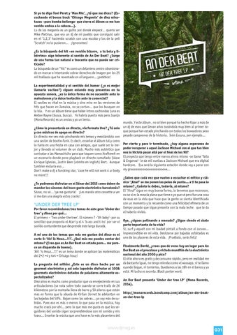 ¿Sabes que cada vez que vuelvo a escuchar el mítico y clá¿Te podremos disfrutar en el Sónar del 2015 como deben de sico ‘¡Knuf’ se me ponen los pelos de punta… a ti te pasa lo mandar los cánones del buen gusto electrónico barcelonés? mismo? ¿Cuánto le debes, todavía, al mismo? Sónar, no sé… !ya me gustaría! ¡Les mando otro cassette a ver El ‘!Knuf’ sigue en muy buena forma, lo tenemos que reconocer, no se si es la mezcla plana que tiene o yo que sé pero fue una cosa si me dan una alegría estos cracks! de esas en la vida que hace que la gente se sienta identificada con un momento y lo recuerde como una felicidad efímera de un ‘UNDER DER TREE LP’ Por favor recomiéndanos tres temas de este gran ‘Under der tiempo pasado que sigue presente con la mala leche que te da el haberlo vivido. tree’ y dinos por qué… El primero – ‘Two under the tree’. El número 7 -‘Oh baby’- por su sencillez que proponía el Atari y el 4 ‘b-ass and t-iss’ por ser el sonido contundente que desprende este larga durada.