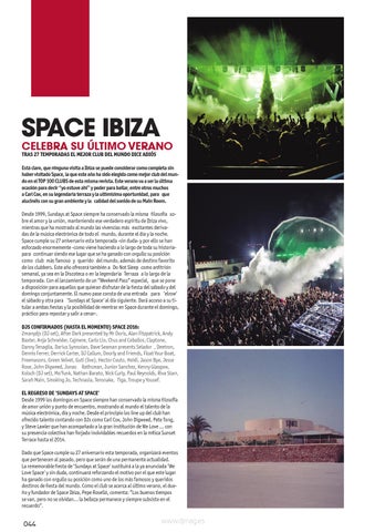 Está claro, que ninguna visita a Ibiza se puede considerar como completa sin haber visitado Space, la que este año ha sido elegida como mejor club del mundo en el TOP 100 CLUBS de esta misma revista. Este verano va a ser la última ocasión para decir “yo estuve ahí” y poder para bailar, entre otros muchos a Carl Cox, en su legendaria terraza y la ultimísima oportunidad, para que alucinéis con su gran ambiente y la calidad del sonido de su Main Room. Desde 1999, Sundays at Space siempre ha conservado la misma filosofía sobre el amor y la unión, manteniendo ese verdadero espíritu de Ibiza vivo, mientras que ha mostrado al mundo las vivencias más excitantes derivadas de la música electrónica de todo el mundo, durante el día y la noche. Space cumple su 27 aniversario esta temporada -sin duda- y por ello se han esforzado enormemente -como viene haciendo a lo largo de toda su historiapara continuar siendo ese lugar que se ha ganado con orgullo su posición como club más famoso y querido del mundo, además de destino favorito de los clubbers. Este año ofrecerá también a Do Not Sleep como anfitrión semanal, ya sea en la Discoteca o en la legendaria Terraza a lo largo de la temporada. Con el lanzamiento de un “Weekend Pass” especial, que se pone a disposición para aquellos que quieran disfrutar de la fiesta del sábado y del domingo conjuntamente. El nuevo pase consta de una entrada para ‘elrow’ el sábado y otra para ‘Sundays at Space’ al día siguiente. Dará acceso a su titular a ambas fiestas y la posibilidad de reentrar en Space durante el domingo, práctico para repostar y salir a cenar-. DJS CONFIRMADOS (HASTA EL MOMENTO) SPACE 2016: 2manydjs (DJ set), After Dark presented by Mr Doris, Alan Fitzpatrick, Andy Baxter, Anja Schneider, Cajmere, Carlo Lio, Chus and Ceballos, Claptone, Danny Tenaglia, Darius Syrossian, Dave Seaman presents Selador , Deetron, Dennis Ferrer, Derrick Carter, DJ Callum, Doorly and Friends, Float Your Boat, Freemasons, Green Velvet, Guti (live), Hector Couto, Heidi, Jason Bye, Jesse Rose, John Digweed, Jonas Rathsman, Junior Sanchez, Kenny Glasgow, Kolsch (DJ set), Mo’funk, Nathan Barato, Nick Curly, Paul Reynolds, Riva Starr, Sarah Main, Smoking Jo, Technasia, Tensnake, Tiga, Troupe y Yousef. EL REGRESO DE ‘SUNDAYS AT SPACE’ Desde 1999 los domingos en Space siempre han conservado la misma filosofía de amor unión y punto de encuentro, mostrando al mundo el talento de la música electrónica, día y noche. Desde el principio los line up del club han ofrecido talento contando con DJs como Carl Cox, John Digweed, Pete Tong, y Steve Lawler que han acompañado a la gran institución de We Love ... con su presencia colectiva han forjado inolvidables recuerdos en la mítica Sunset Terrace hasta el 2014. Dado que Space cumple su 27 aniversario esta temporada, organizará eventos que pertenecen al pasado, pero que serán de una permanente actualidad. La rememorable fiesta de ‘Sundays at Space’ sustituirá a la ya anunciada ‘We Love Space’ y sin duda, continuará reforzando el motivo por el que este lugar ha ganado con orgullo su posición como uno de los más famosos y queridos destinos de fiesta del mundo. Como el club se acerca al último verano, el dueño y fundador de Space Ibiza, Pepe Roselló, comenta: “Los buenos tiempos se van, pero no se olvidan… la belleza permanece y siempre subsiste en el recuerdo”.