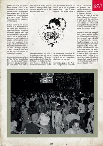por el LSD durante los primeros días. Puede que haya sido esa presión de rendir al máximo siempre que llevó a Levan al uso de drogas más duras. Tristemente, murió el 8 de noviembre de 1992 de un fallo cardíaco, provocado por una enfermedad que ya padecía desde que fuese un niño y empeorada, seguramente, por su estilo de vida. Aunque el genio de Levan le llevó a hacer realidad uno de los clichés más oídos de la música: conseguir vivir más allá de su muerte gracias a su música. En una época en la que el remix tenía poco que ver con remplazar partes físicas determinadas de una canción, sino en ajustar el ánimo y el movimiento, el flujo y reflujo, él era el maestro. Este sigue siendo la parte bonita y genial de un mix de Larry Levan. Poned uno y, desde algún lugar, él seguirá embelesando con su hechizo a cualquiera que le baile.