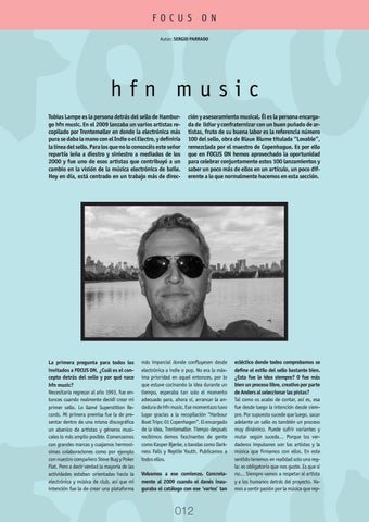 hfn music Tobias Lampe es la persona detrás del sello de Hamburgo hfn music. En el 2009 lanzaba un varios artistas recopilado por Trentemøller en donde la electrónica más pura se daba la mano con el Indie o el Electro, y definiría la línea del sello. Para los que no lo conozcáis este señor repartía leña a diestro y siniestro a mediados de los 2000 y fue uno de esos artistas que contribuyó a un cambio en la visión de la música electrónica de baile. Hoy en día, está centrado en un trabajo más de direc-