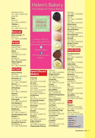 Tahlia St. Tel: +966-2-6690895 Crepe Factory Al-Shati Dist Tel: +966-2-6995676 Crunchez Red Sea Mall Tel: +966-2-2150145 Crusty Rawdah St. Tel: +920026633 Dactylifera Prince Sultan St. Tel: +920008182 Edible Arrangments Batarji St. Tel: +920024070 Helen’s Kitchen Kayyal St. Tel: +966-2-6977729 La Fraise Andalus St. Tel: +966-2-6511312 Le Croissant Shop Khalideya Dist. Tel: +966-2-6065184 Le Gourmet Tahlia St. Tel: +966-2-6605061 Le Notre Tahlia St. Tel: +966-2-2611222 Le Vendome