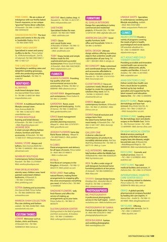 H.Q. INTERIORS 100% made in Italy furniture within the Middle East. Al Madinah Rd. • Mob: 966-565659229 • Web: hq-interiors.com IKEA To offer a wide range of well-designed, functional home furnishing products at low prices. Al Aziziyah • Tel: 966-920004532 • Web: ikea.com SINWAN Concept design house. Khaldiya Dist., Abdullah Aba Al Khalil St.• Tel: 966-12-6060811• Web: sinwanconcept