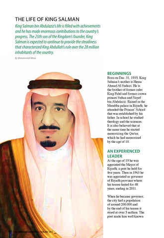 THE LIFE OF KING SALMAN King Salman bin Abdulaziz’s life is filled with achievements and he has made enormous contributions to the country’s progress. The 25th son of the Kingdom’s founder, King Salman is expected to continue to provide the steadiness that characterized King Abdullah’s rule over the 28 million inhabitants of the country. By Mohammed Mirza
