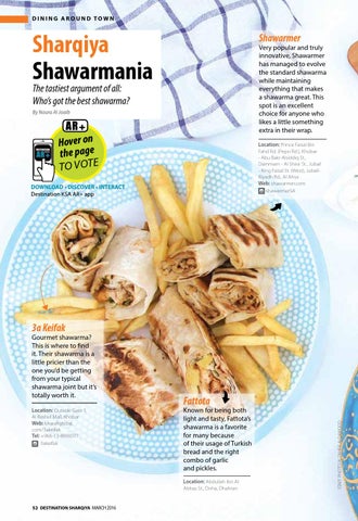 Location: Prince Faisal Bin Fahd Rd. (Pepsi Rd.), Khobar - Abu Bakr Alsiddiq St., Dammam - Al Shira’ St., Jubail - King Faisal St. (West), JubailRiyadh Rd., Al Ahsa Web: shawarmer.com shawarmerSA