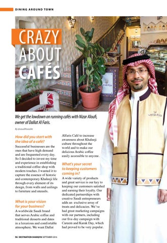 A worldwide Saudi brand that serves Arabic coffee and traditional desserts and dates in a luxurious and comfortable atmosphere. We want Dallat 56 DESTINATION SHARQIYA SEPTEMBER 2016
