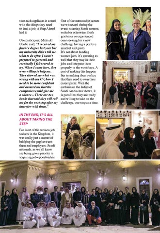 One of the memorable scenes we witnessed during the event is seeing Saudi women, veiled or otherwise, fresh graduates or experienced One participant, Maha Al ones seeking for a new Otaibi, said, “I received my challenge having a positive finance degree last year but mindset and gusto. It’s not about handing my university didn’t tell me women jobs, it’s ensuring as what to do after. I wasn’t well that they stay in their prepared to get work and jobs and integrate them eventually I felt scared to try. When I came here, they properly in the workforce. A were willing to help me. part of making this happen lies in making them realize They showed me what was that they need to own their wrong with my CV, how I career paths. With the need to be more confident enthusiasm the ladies of and assured me that the Saudi Arabia has shown, it companies would give me a chance—There are two is proof that they are ready banks that said they will call and willing to take on the me for the next step after my challenge, one step at a time. interview with them.”