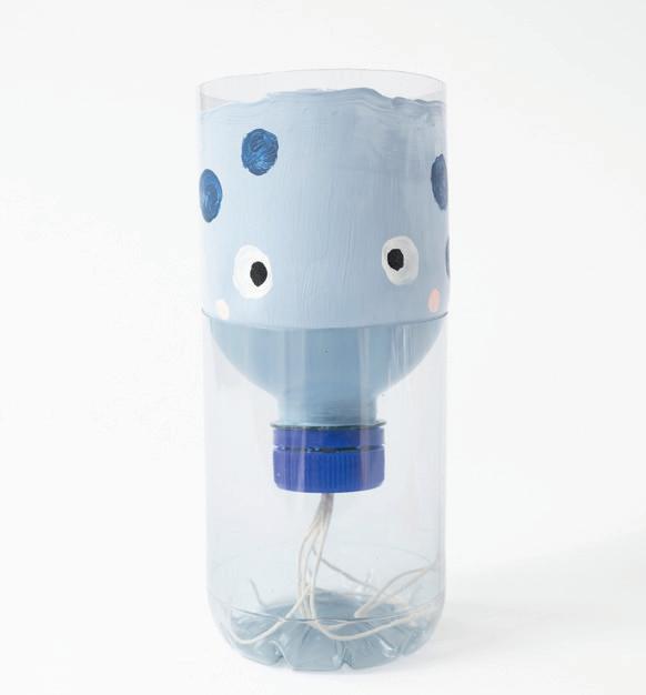 Häll på jord i överdelen av flaskan och sprid ut snörena jämnt i jorden. Sätt ett frö i jorden eller plantera en liten växt i krukan. Häll vatten i den undre delen av flaskan, men inte för mycket. Vattnet ska täcka de snören som hänger ut från korken men inte täcka korken på flaskan.