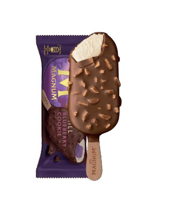 Godaste gräddglassen. Den här nyheten smakar blåbärskaka! Chokladöverdraget har små kakbitar och längst inne finns blåbärssorbet. Magnum chill kostar 31 kronor.