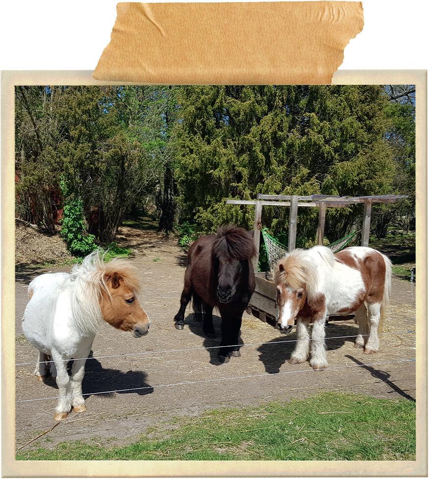 I dag har ponnyerna allt som behövs för att leva ett bra hästliv. De går på lösdrift i en ängshage och en skogshage, och så finns det ett hus med massor av halm där de kan gå in när de vill. Ponnyerna rids inte, men ibland går de ut på promenader i ett slags koppel. Fast ibland kan det vara lite svårt att hålla ihop dem, för de är nyfikna och vill utforska den nya spännande naturen. Eftersom alla tre är ganska gamla nu så springer de inte så mycket, men det händer ibland att de jagar varandra!