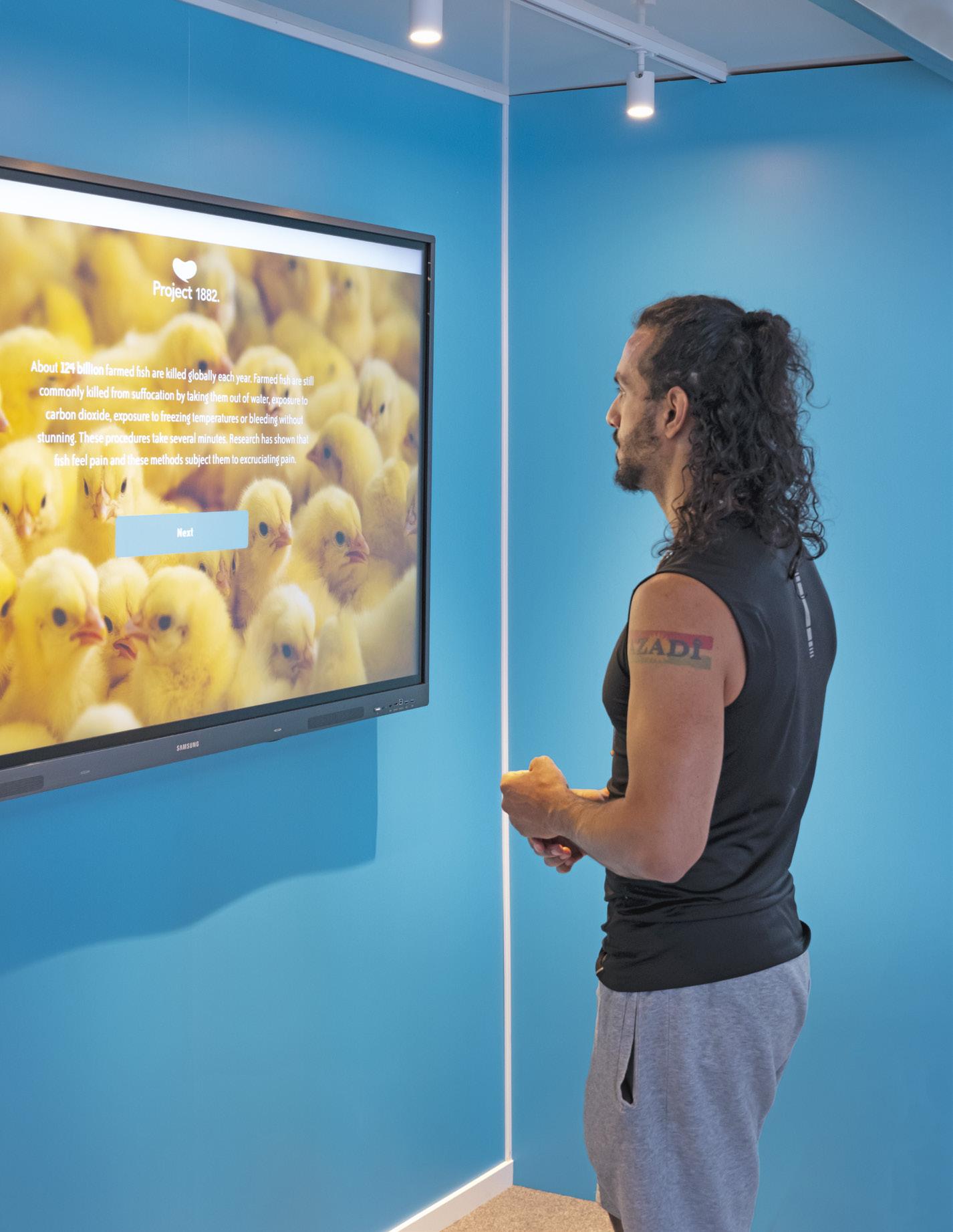 Hur många djur transporteras på EU:s vägar? Hur många fiskar dödas i fiskfabriker varje år? På den här skärmen kan besökarna testa sina kunskaper om djuren i Europas djurfabriker.