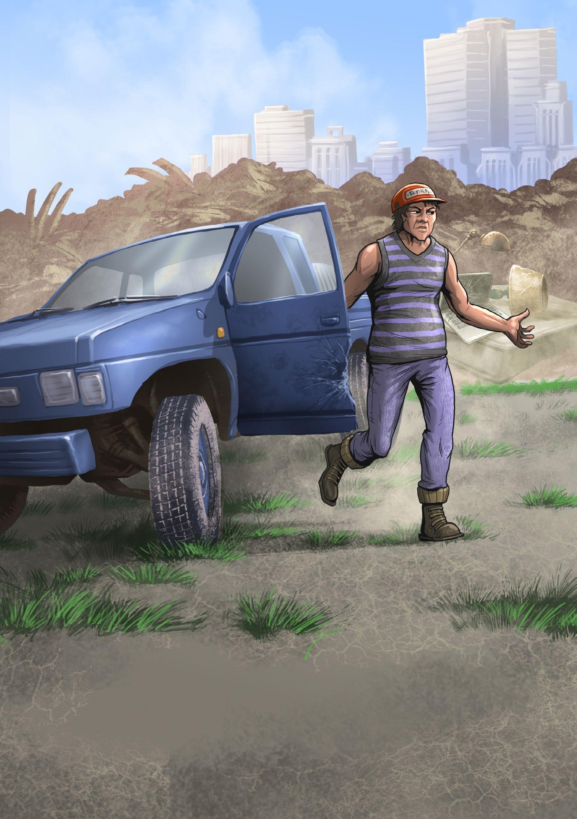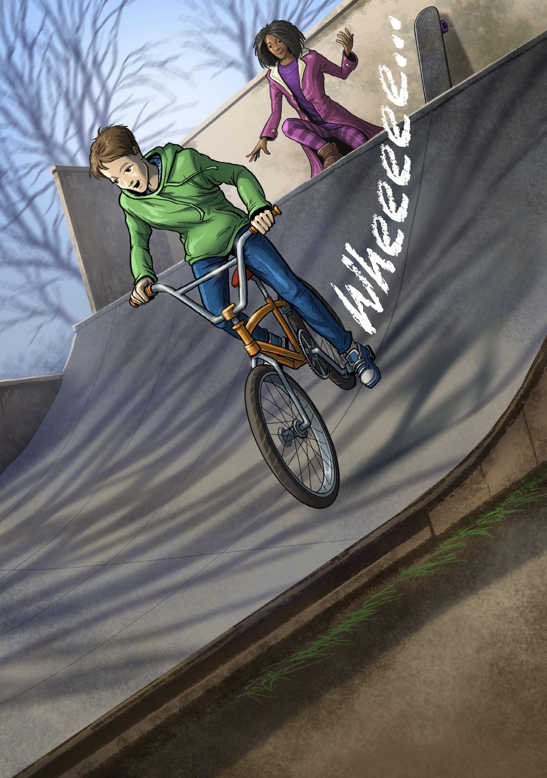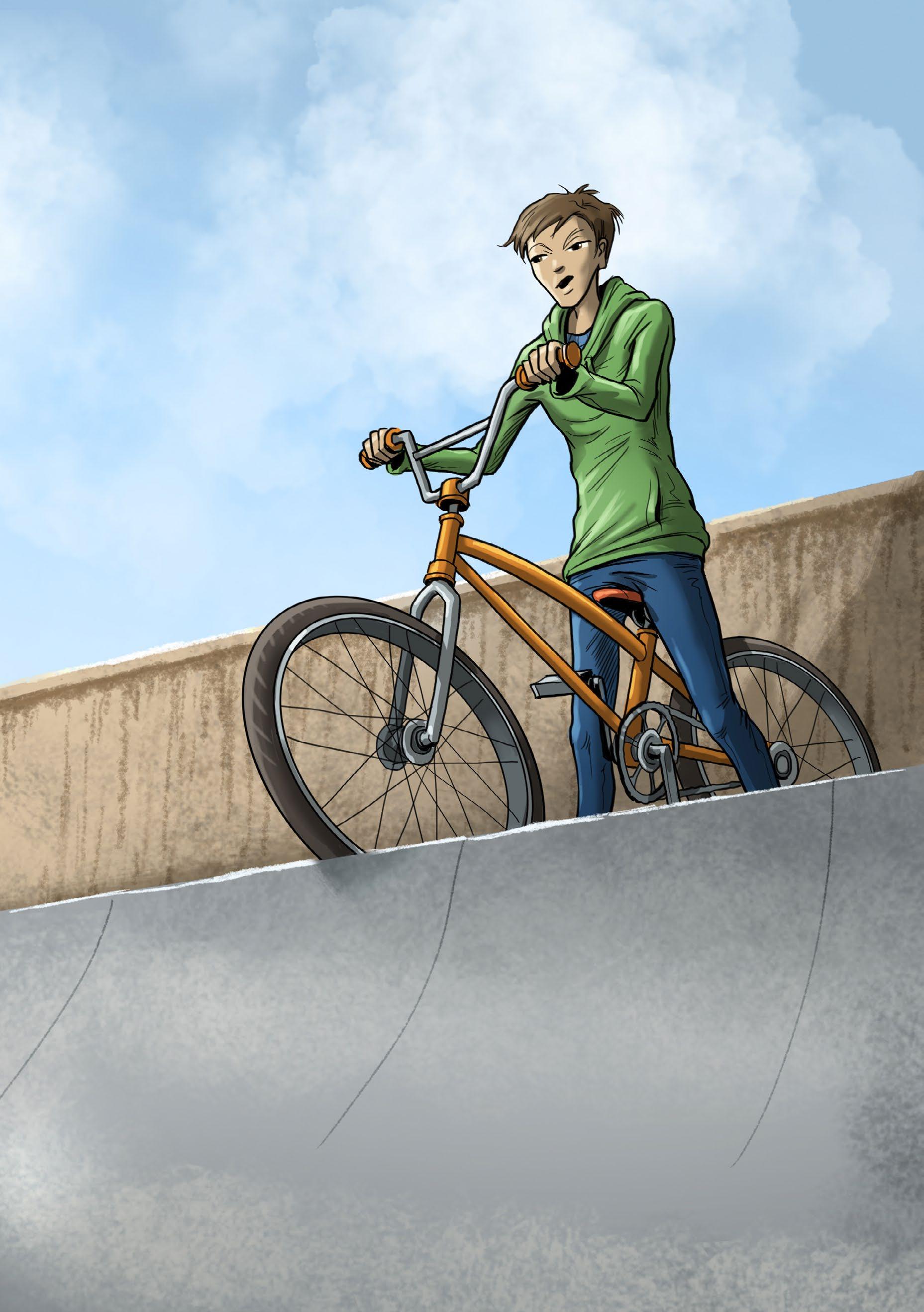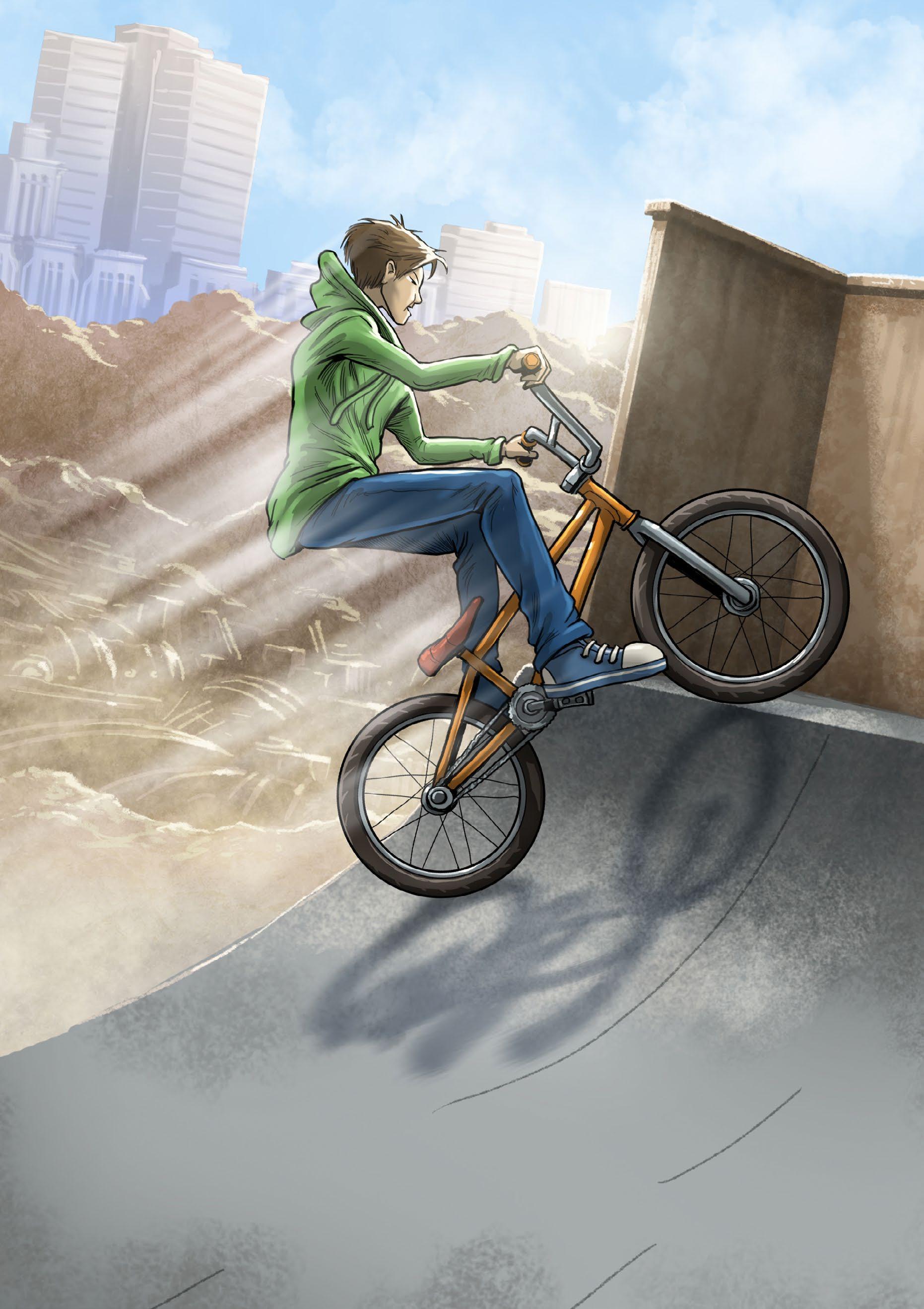 Ben hops on his BMX. He huffs and puffs up the ramp. At the top of the ramp Ben can see the dump.