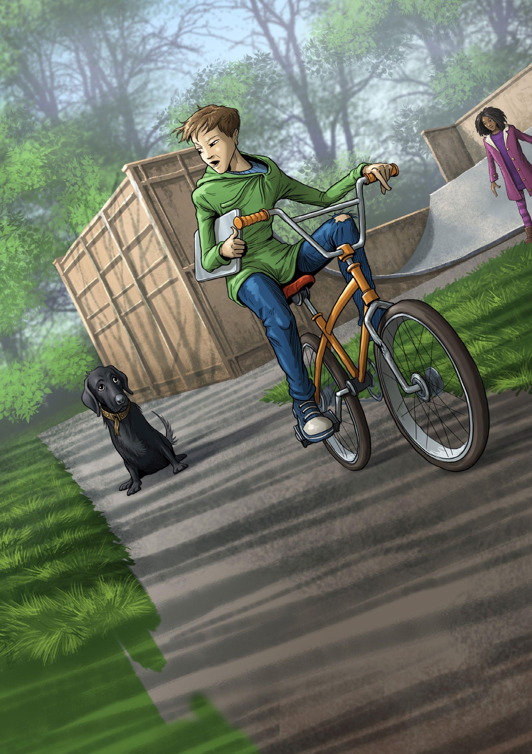 “Mum will not let me have a dog,” Ben tells Sal. He is sad. He gets onto his BMX and sets off. “Sit!” he tells the dog. The dog sits and sulks.