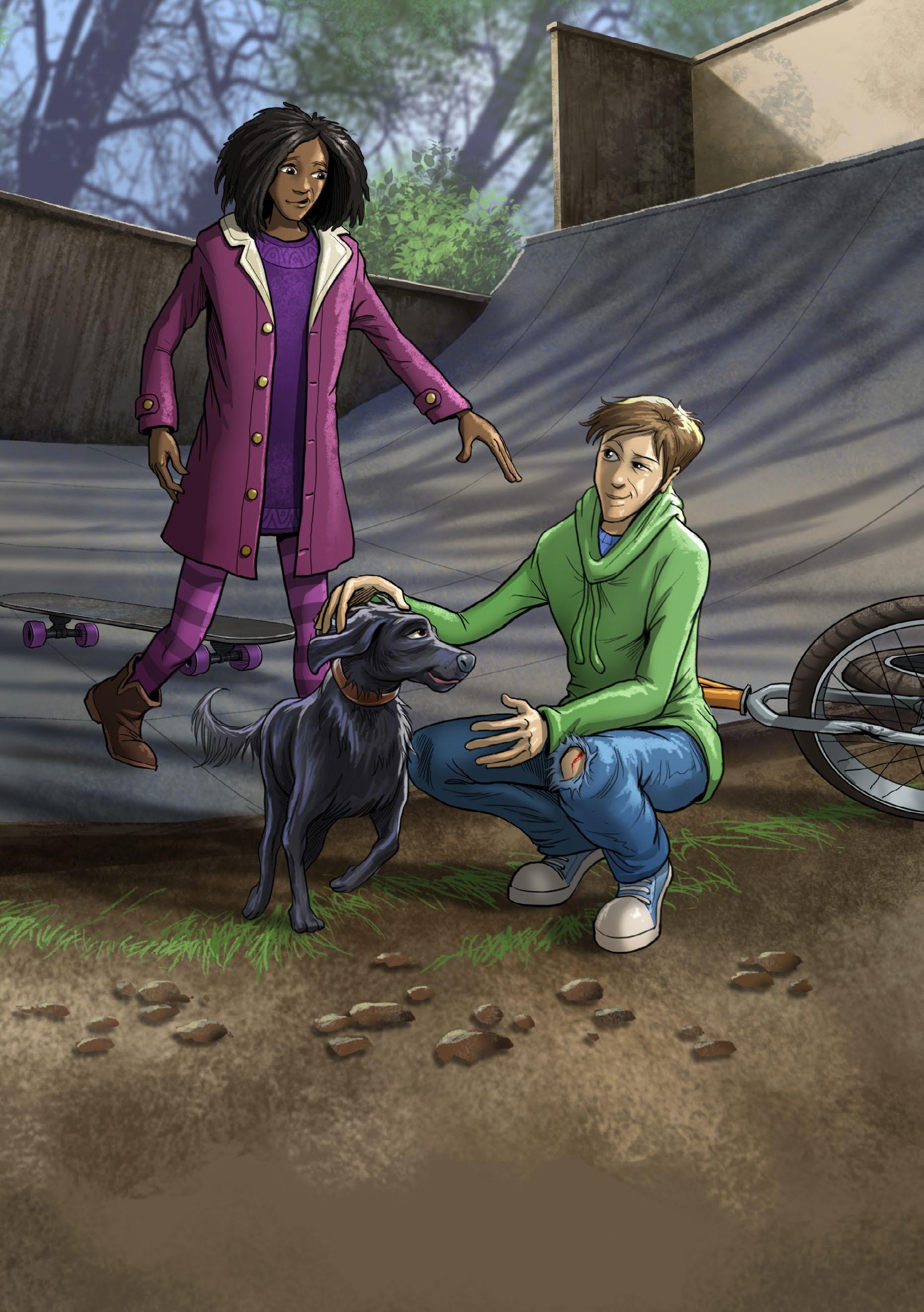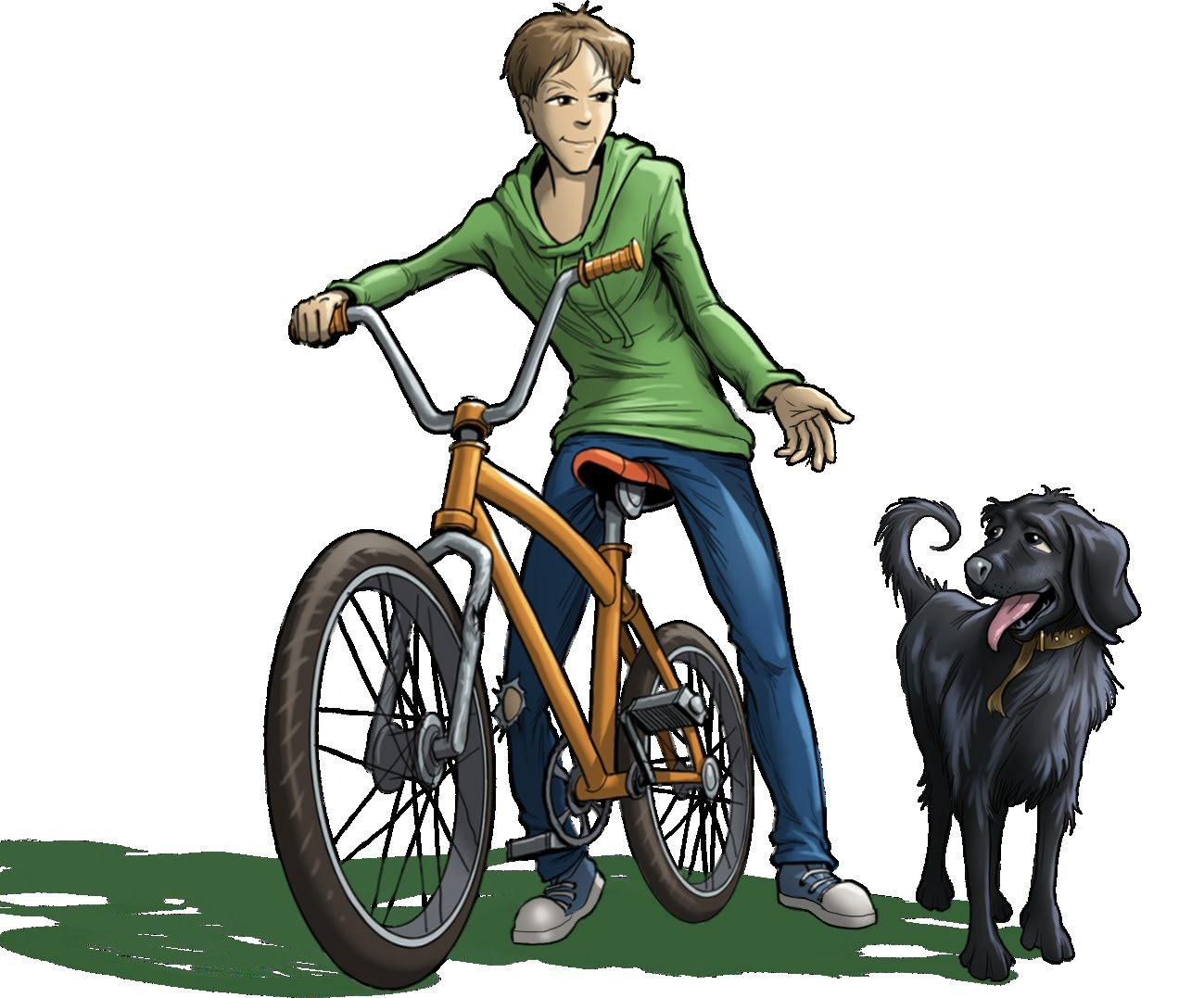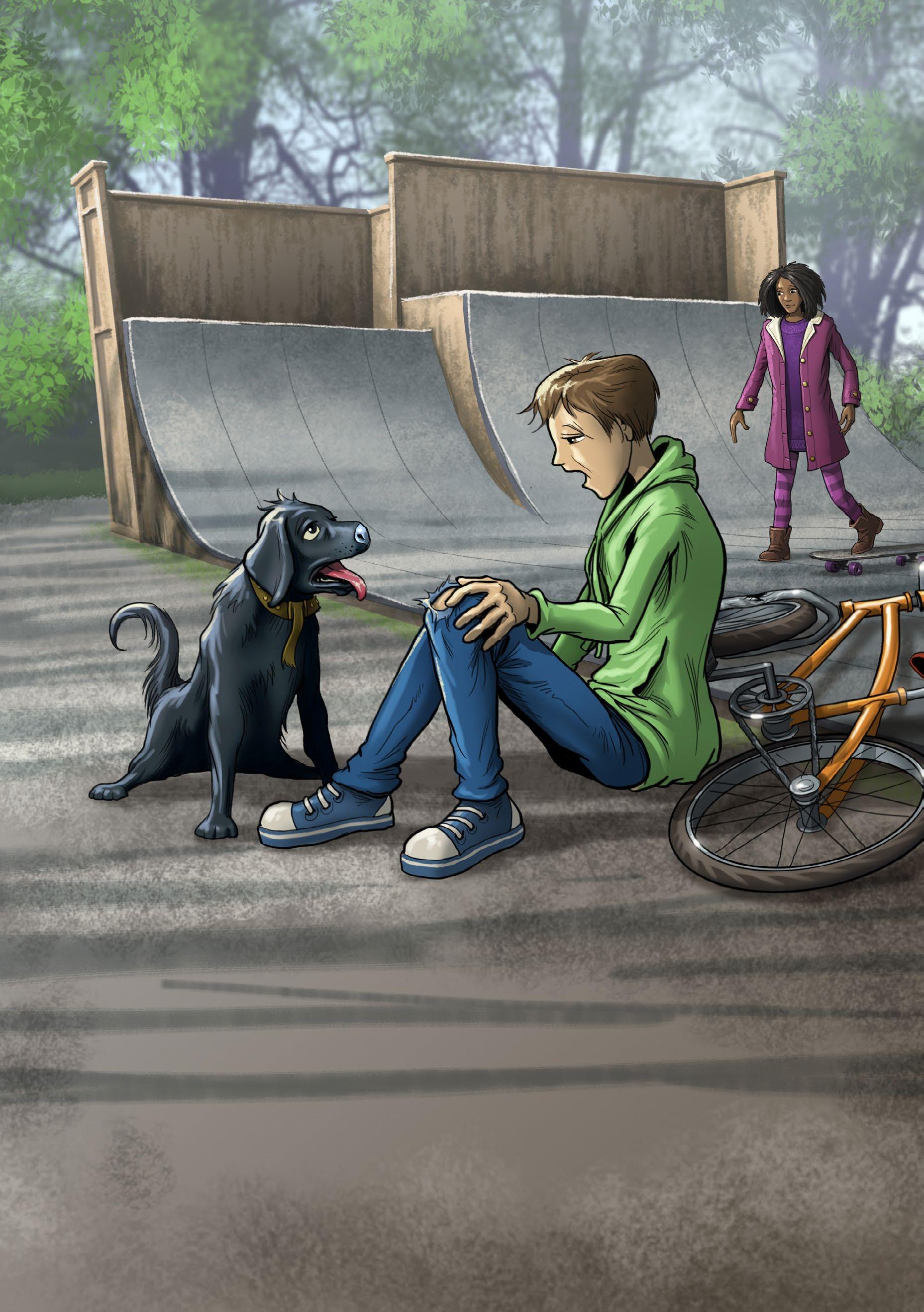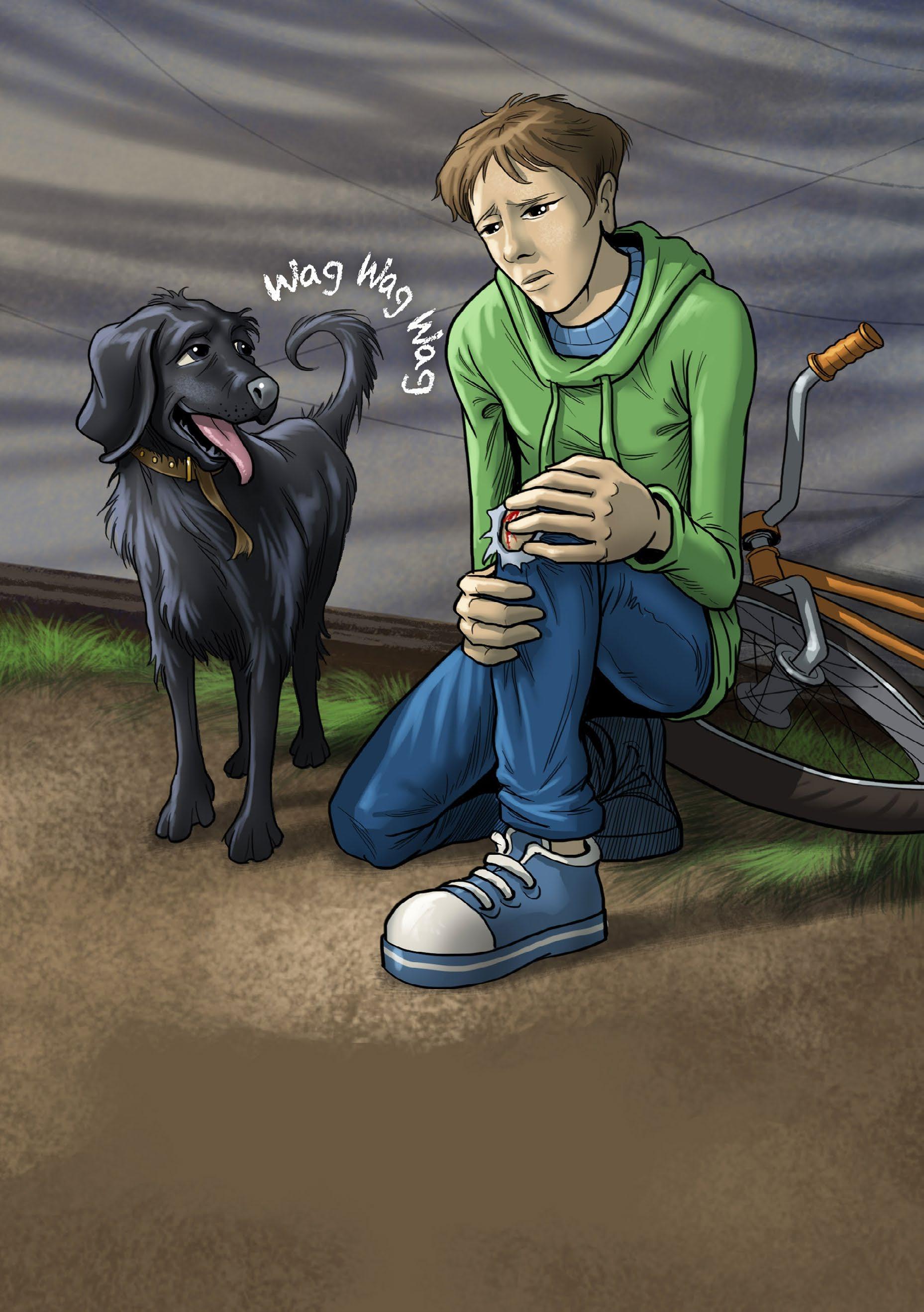 2. How does the dog react when Ben falls from his bike? (page 8)