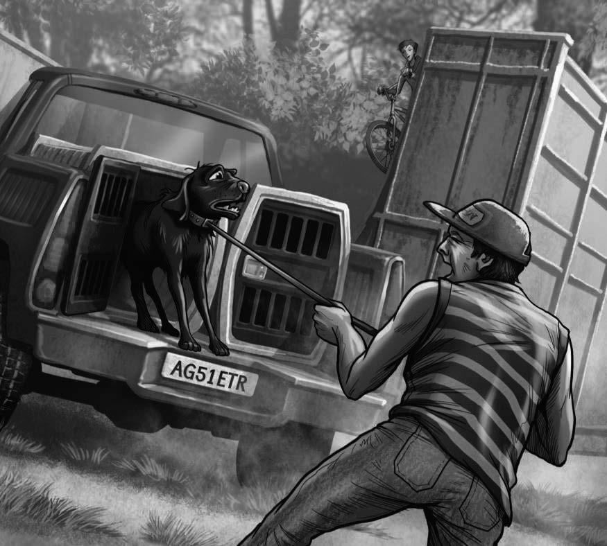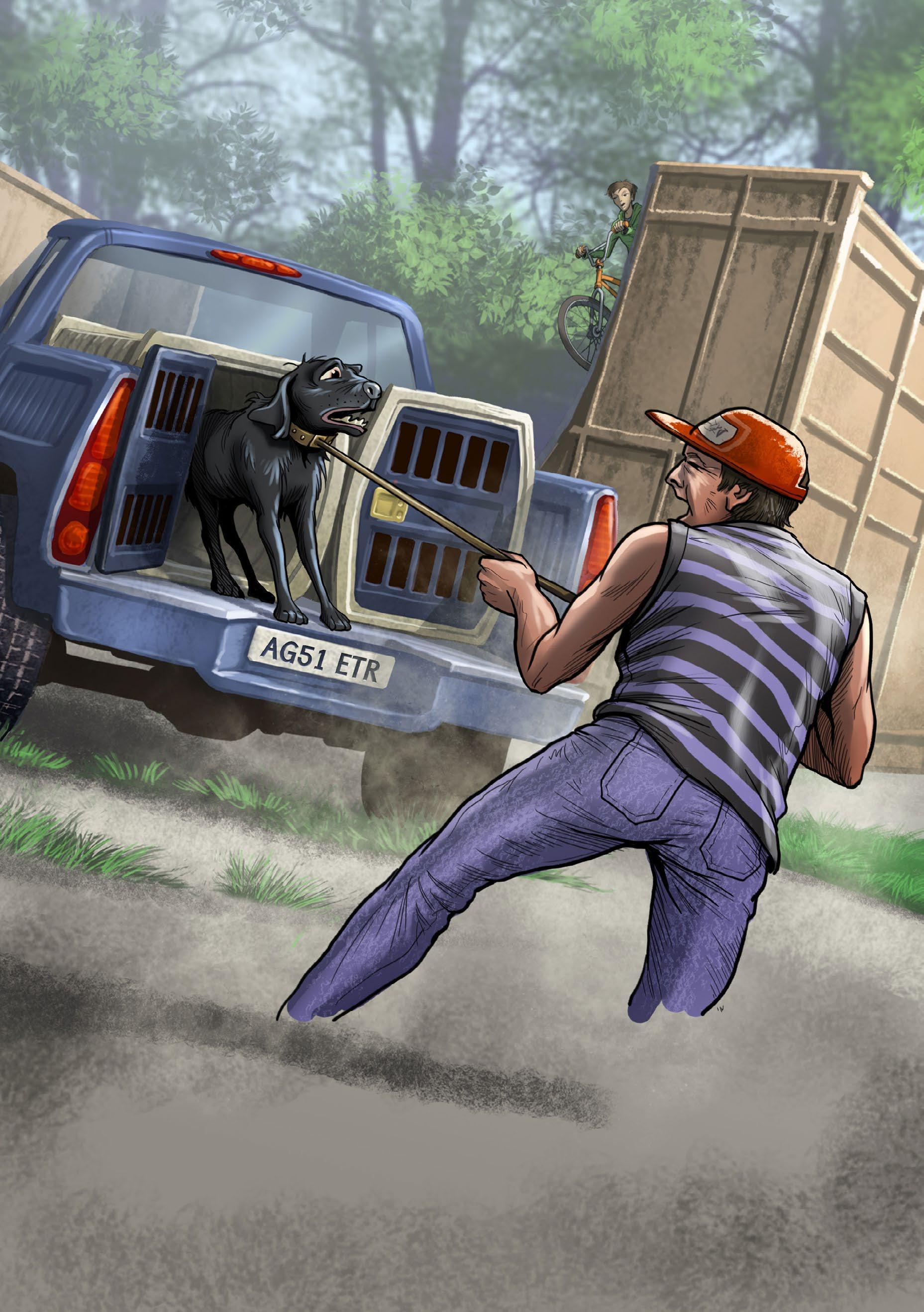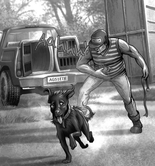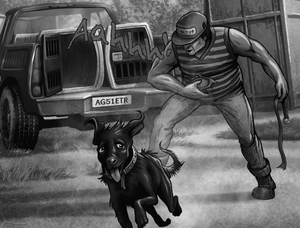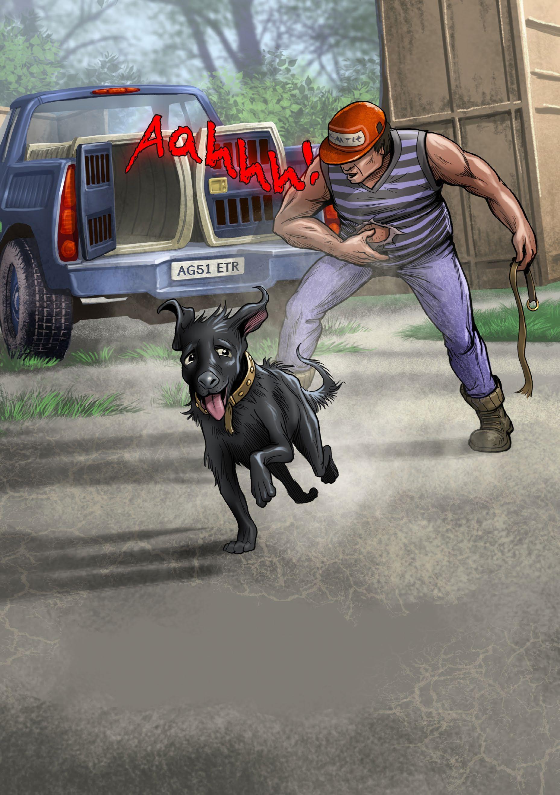 “Aahhh!” the man yells. He lifts his hand but the dog jumps and runs off. The man sets off in the van.