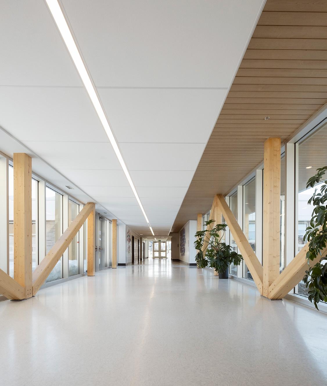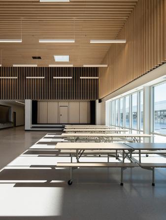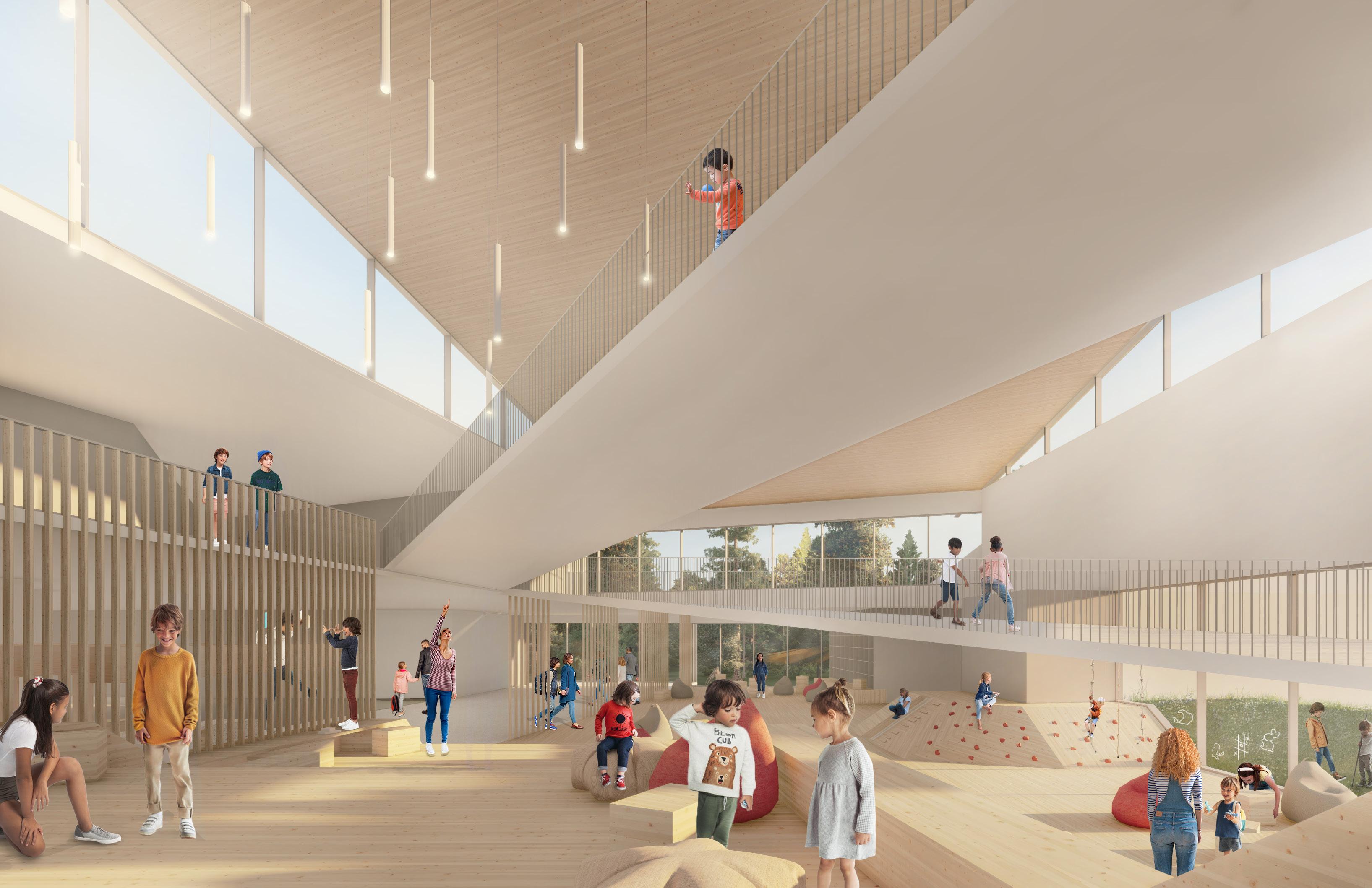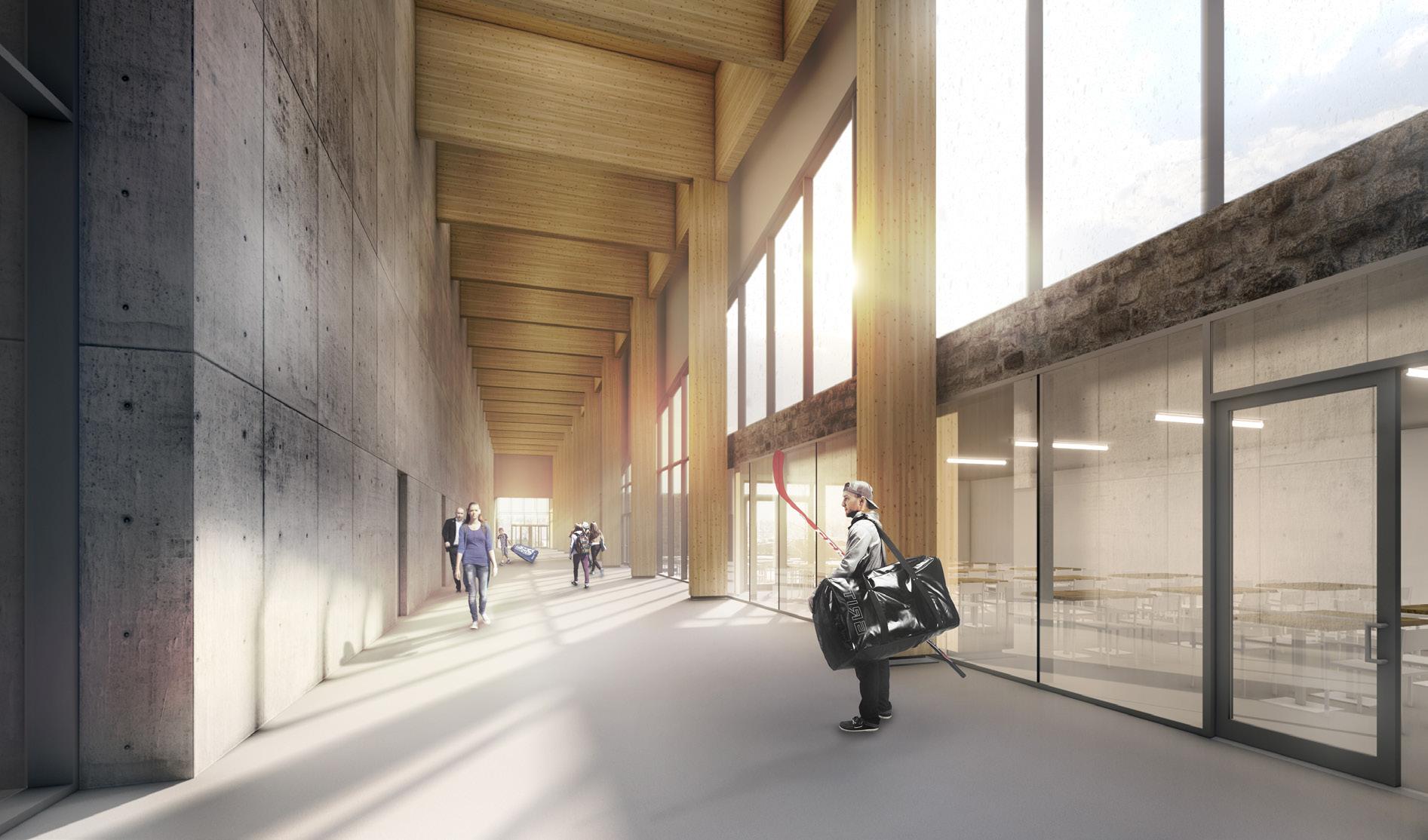 Au son de la cloche, les élèves sont invités dans un parcours à la lisière du boisé, pour entrer dans l’axe transversal que constitue le cœur de l’école, une agglomération tridimensionnelle regroupant les espaces polyvalents et flexibles pour manger, la cuisine, les arts plastiques, la musique, le bloc sportif et le vestiaire unique accessible de l’ensemble des accès aux cours extérieures, concentrant la circulation et facilitant l’entretien. Sous forme d’atrium, cet espace laisse entrer le paysage dans l’école et relie physiquement le boisé, le pré, le potager ainsi que tous les niveaux entre eux créant différentes ambiances.
