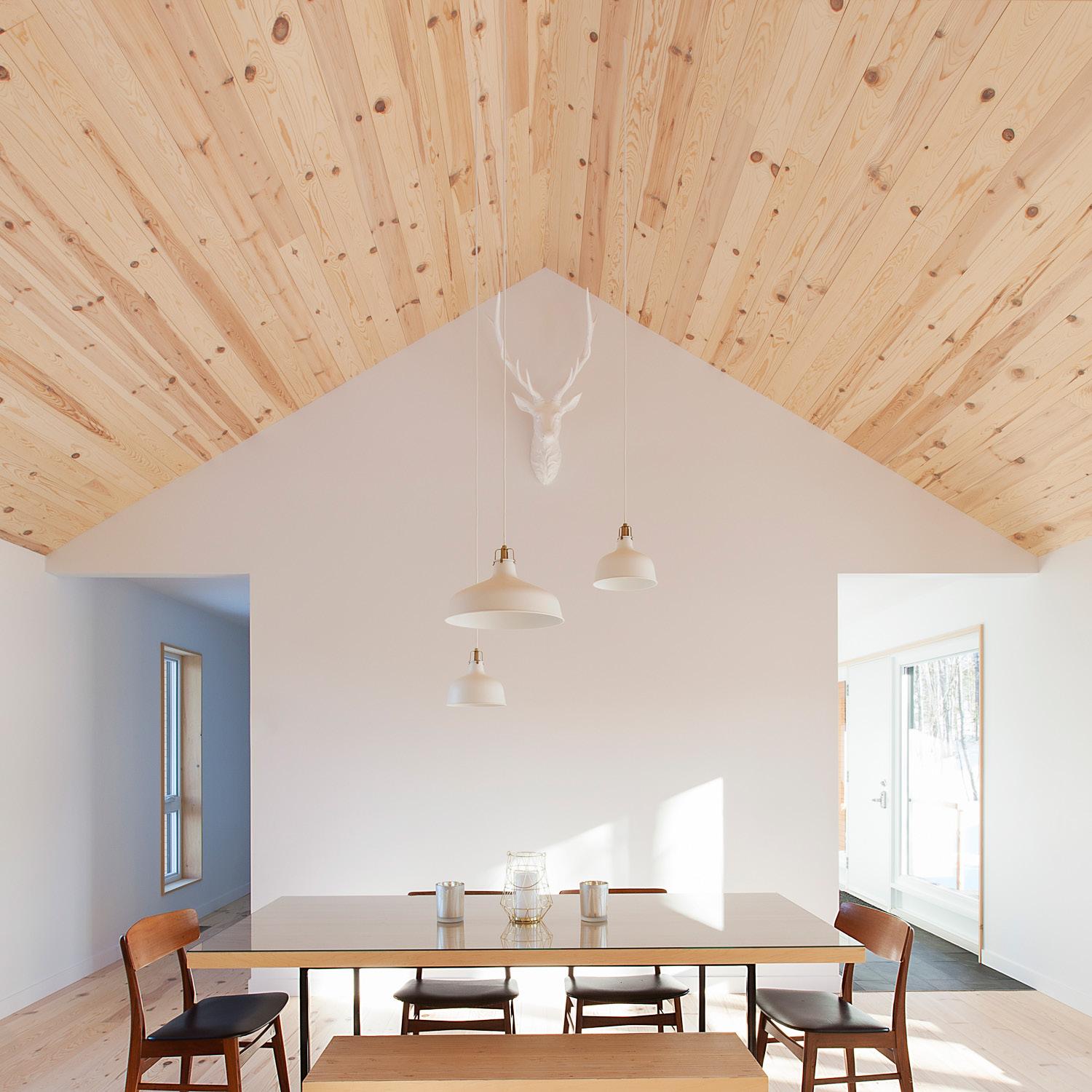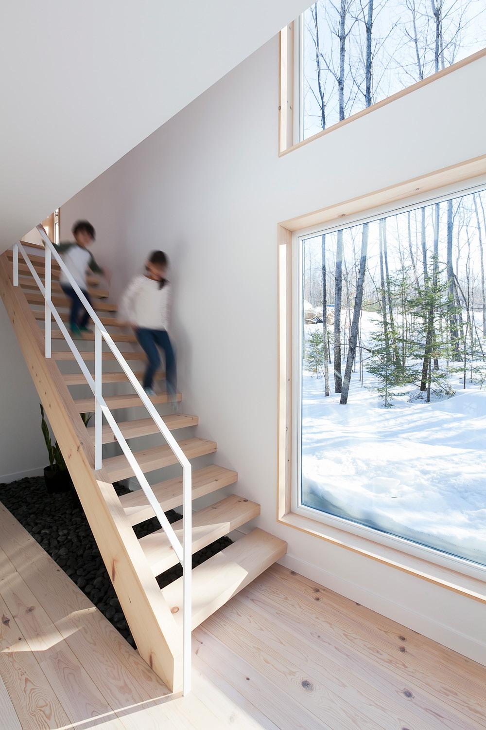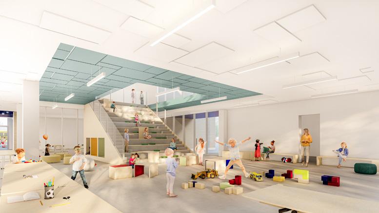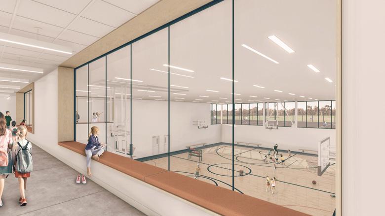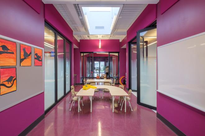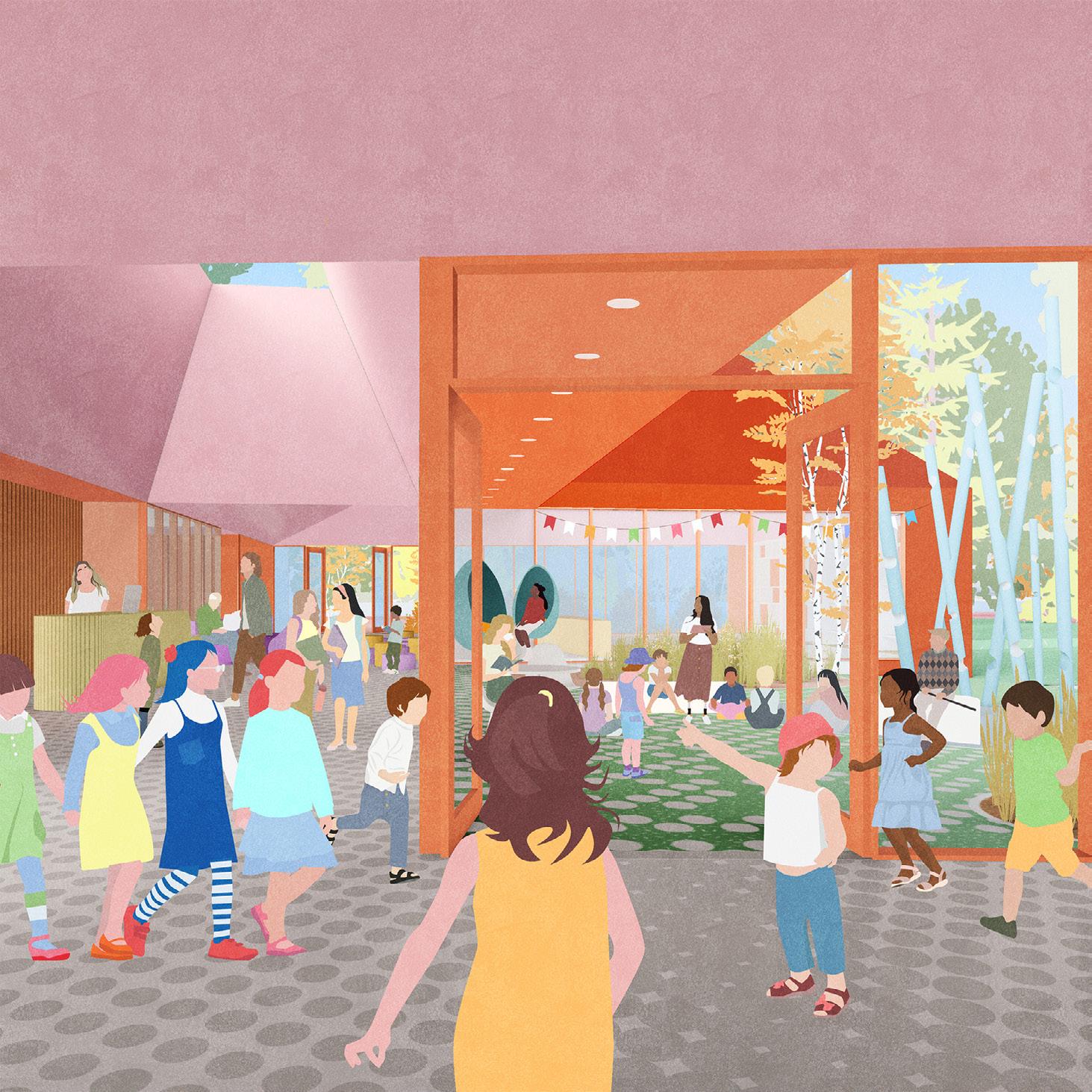 Au son de la cloche, les élèves sont invités dans un parcours à la lisière du boisé, pour entrer dans l’axe transversal que constitue le cœur de l’école, une agglomération tridimensionnelle regroupant les espaces polyvalents et flexibles pour manger, la cuisine, les arts plastiques, la musique, le bloc sportif et le vestiaire unique accessible de l’ensemble des accès aux cours extérieures, concentrant la circulation et facilitant l’entretien. Sous forme d’atrium, cet espace laisse entrer le paysage dans l’école et relie physiquement le boisé, le pré, le potager ainsi que tous les niveaux entre eux créant différentes ambiances.