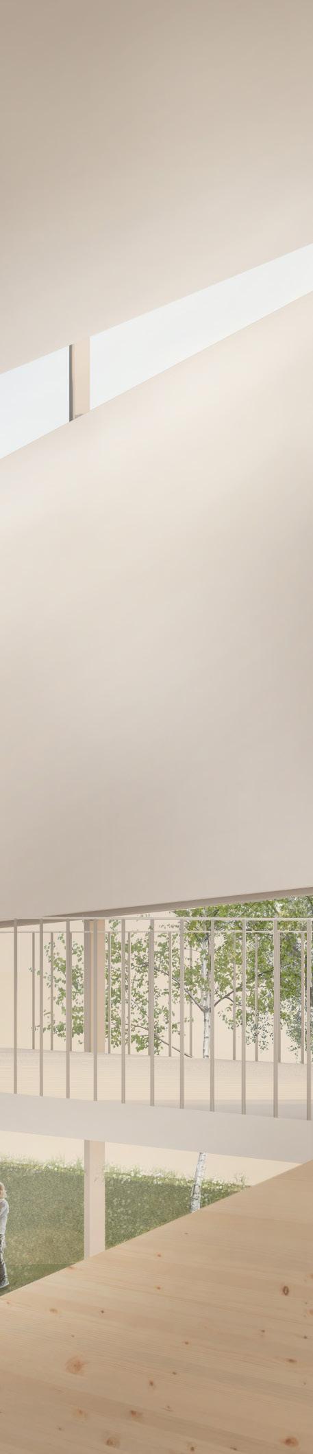 Les cinq volumes sont judicieusement positionnés afin de créer trois cours intérieures immersives au sein desquelles sont déployés des jardins thématiques. Le jardin nourricier est accessible de la cuisine atelier et de la salle du personnel. Le jardin auditif où sera installée l’œuvre d’art est un espace plus vaste et accessible, lié au bistro et pouvant recevoir les usagers de la salle polyvalente pendant l’entracte. Le jardin olfactif est quant à lui adjacent à la zone adulte, qui dispose de sa propre terrasse de lecture, intime et introspective.