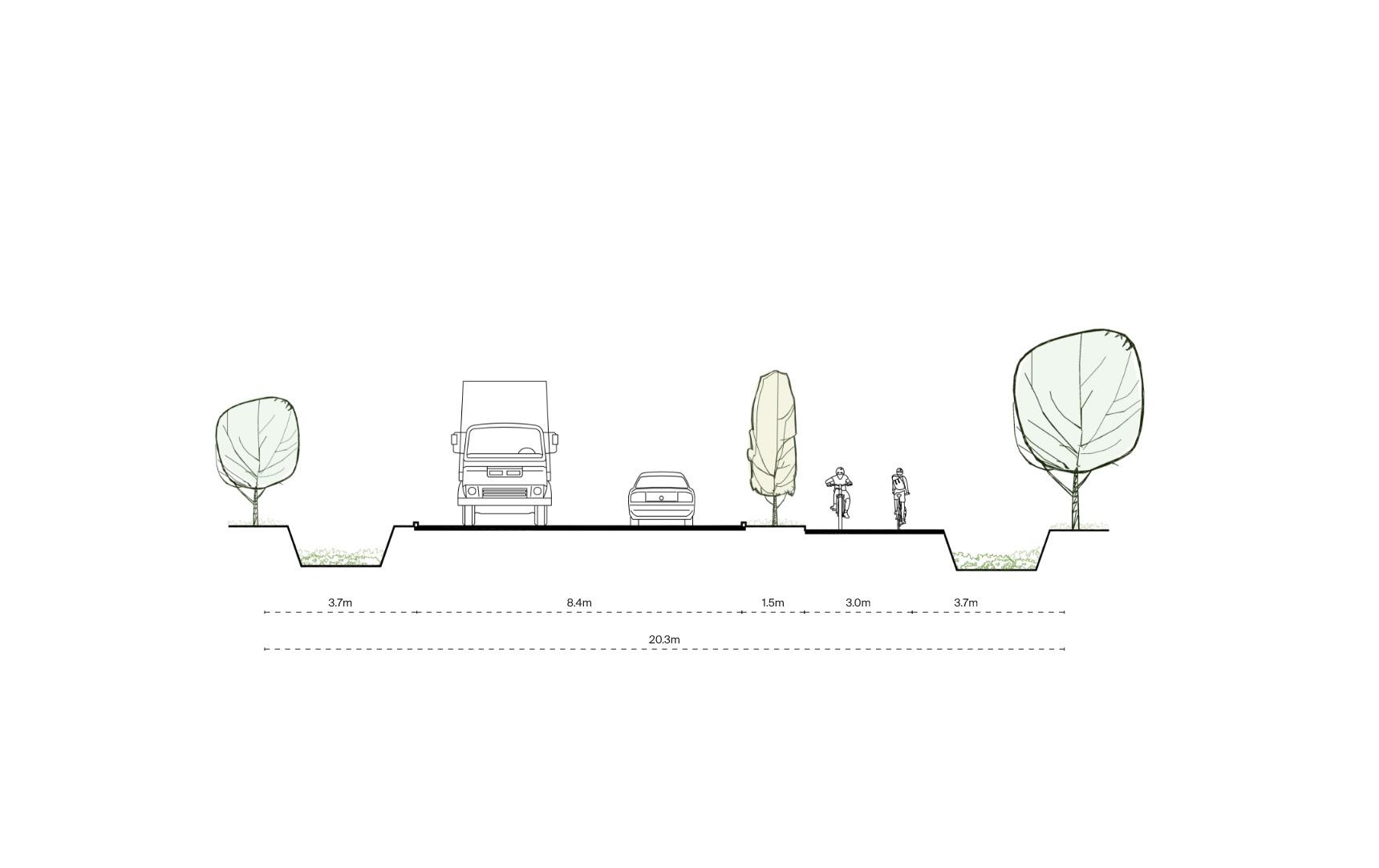 Dans le but d’en tirer profit au maximum, les infrastructures routières sont poussées au périmètre, nous donnant une parcelle résiduelle de jardin.