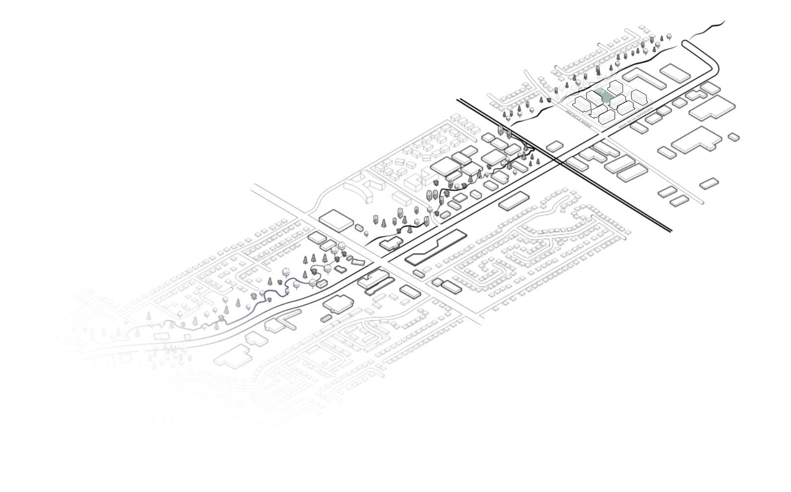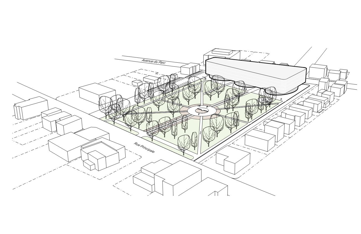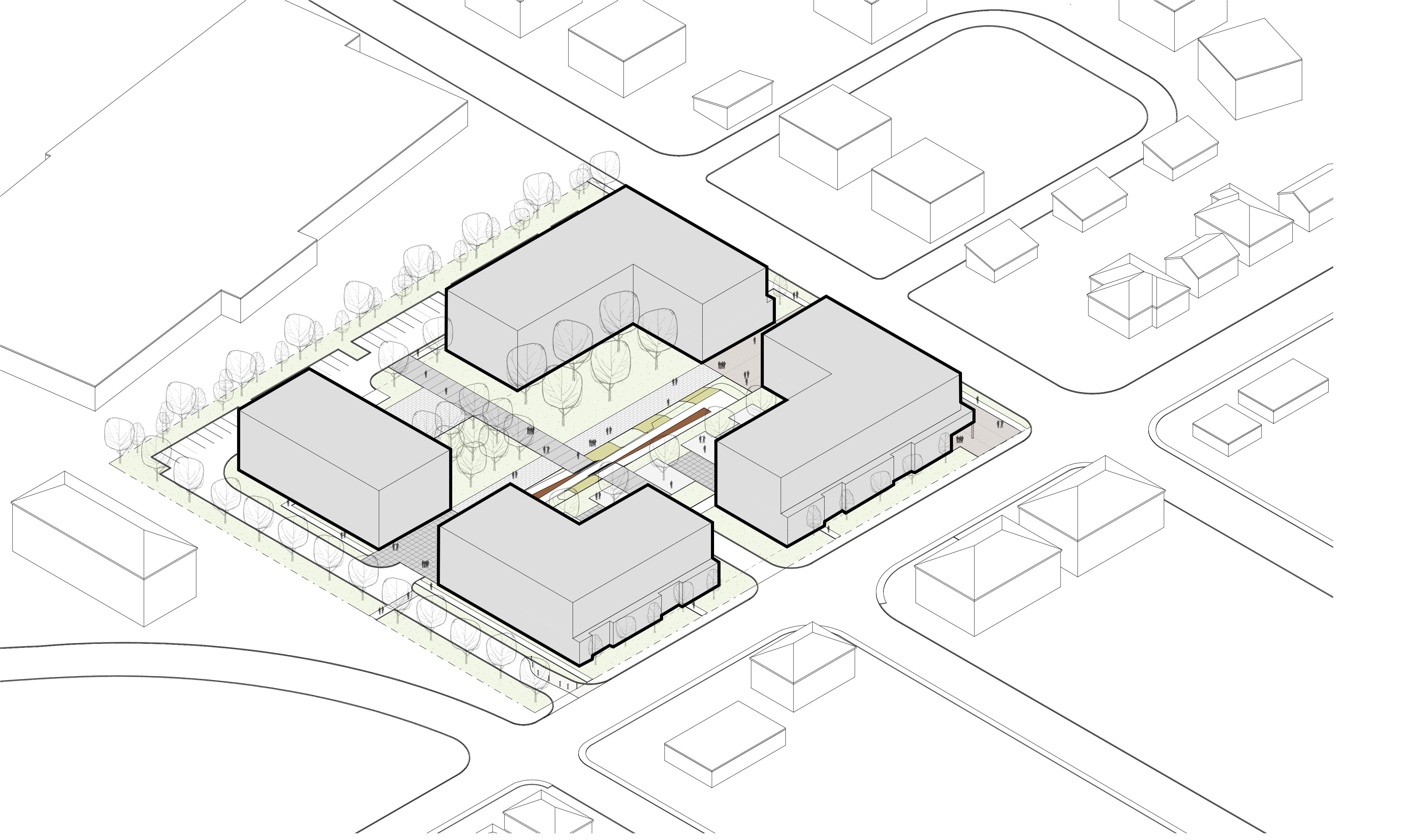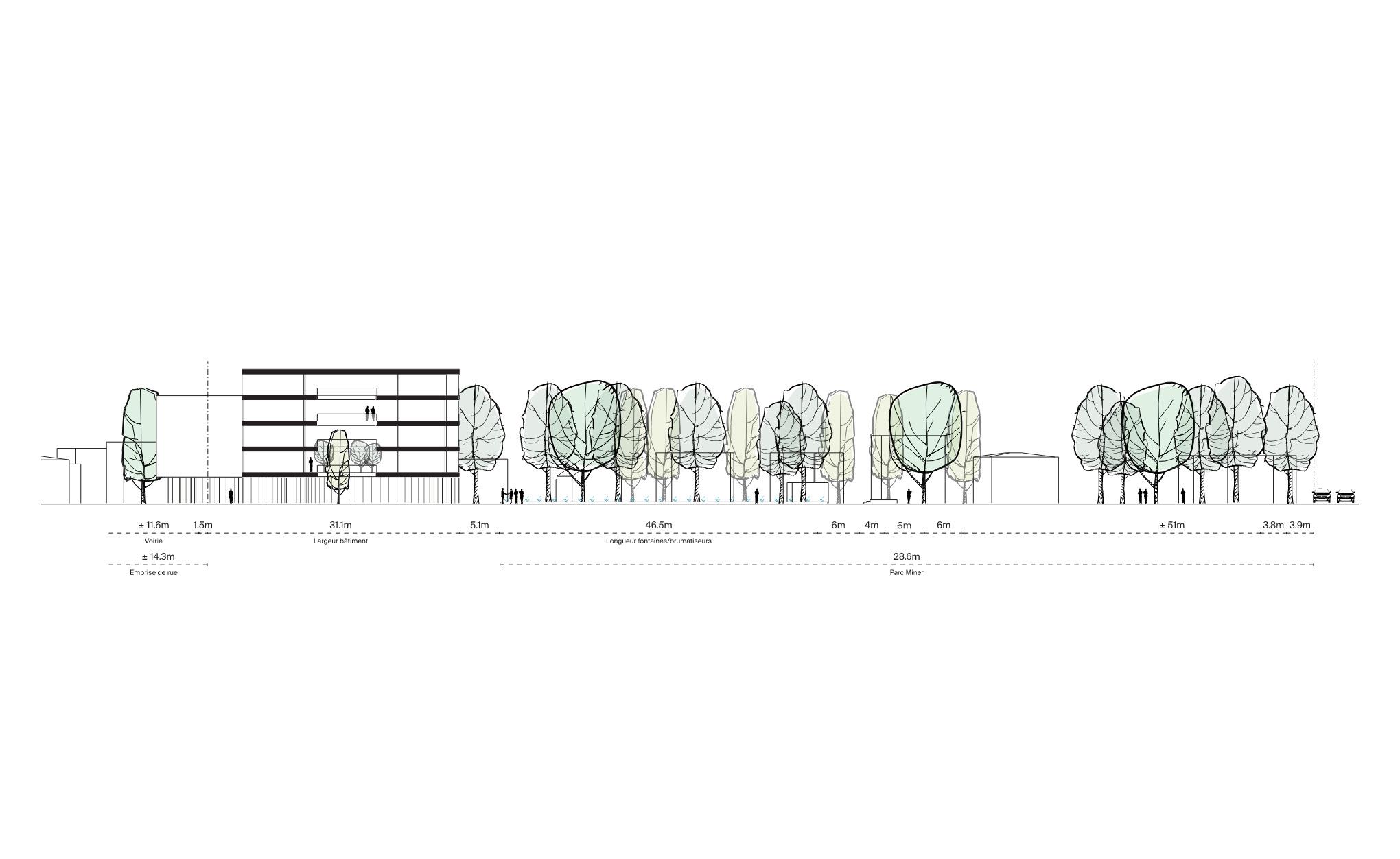 Chaque bâtiment a une densité propre et une typologie influencée par son environnement urbain. Un couvert végétal mature caractérise le site existant et permet de créer une zone tampon autour du projet.