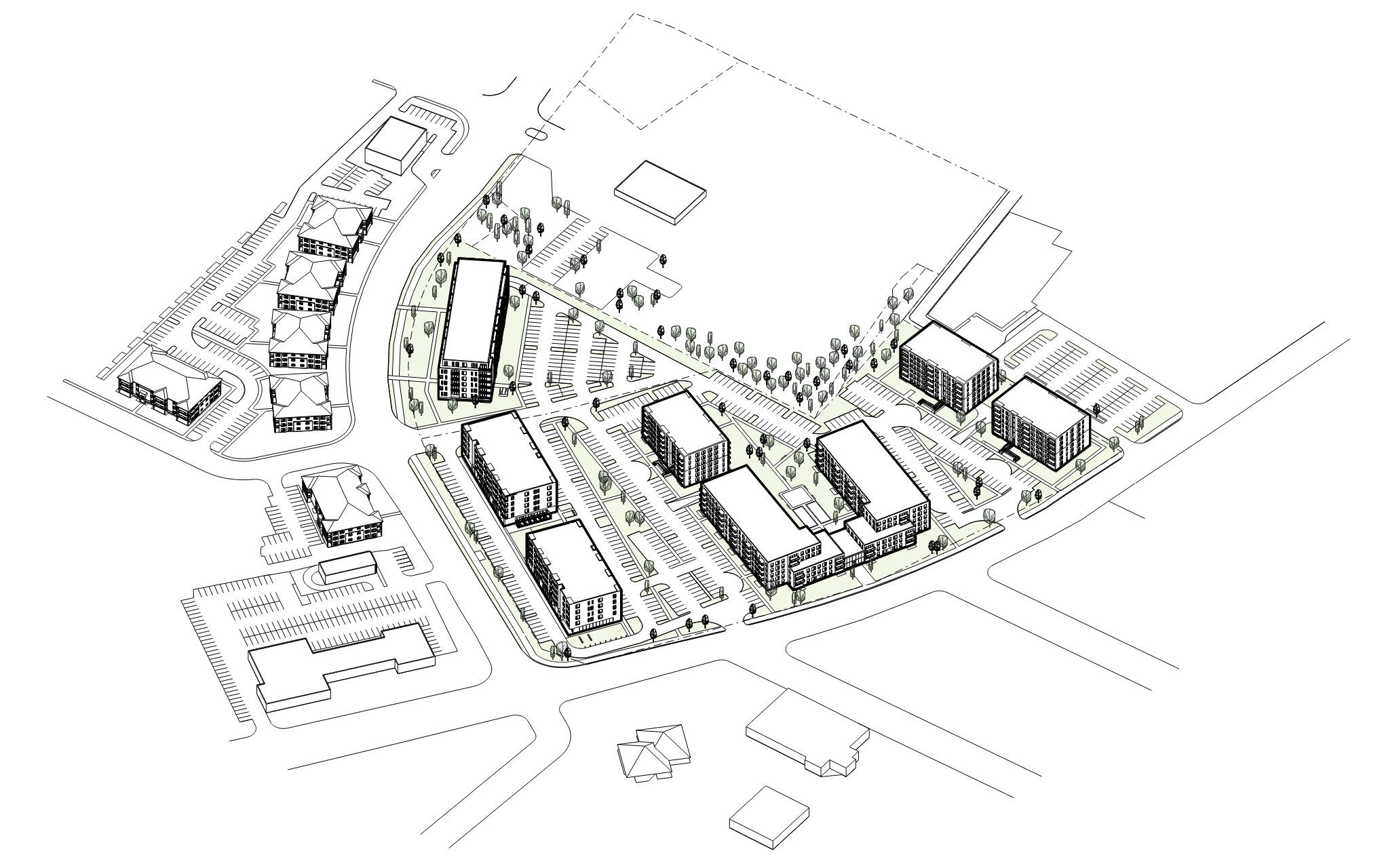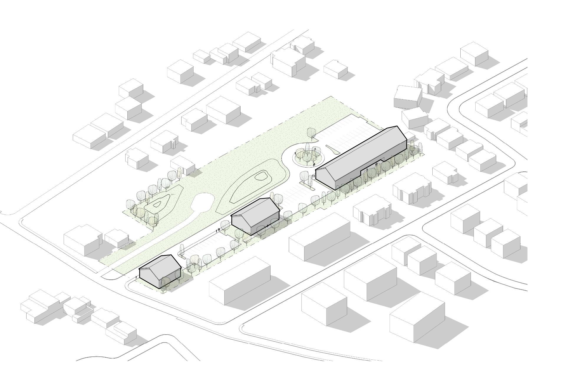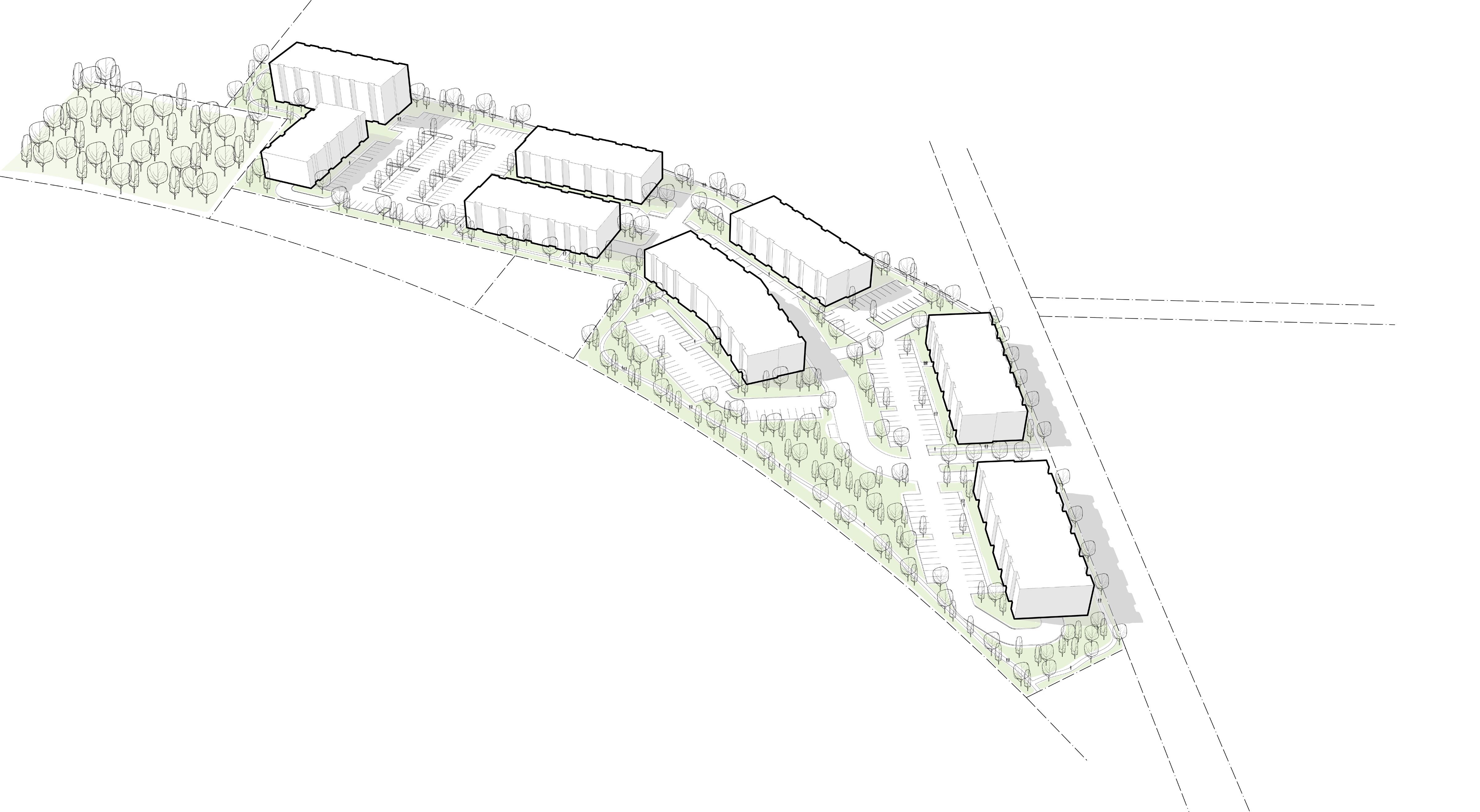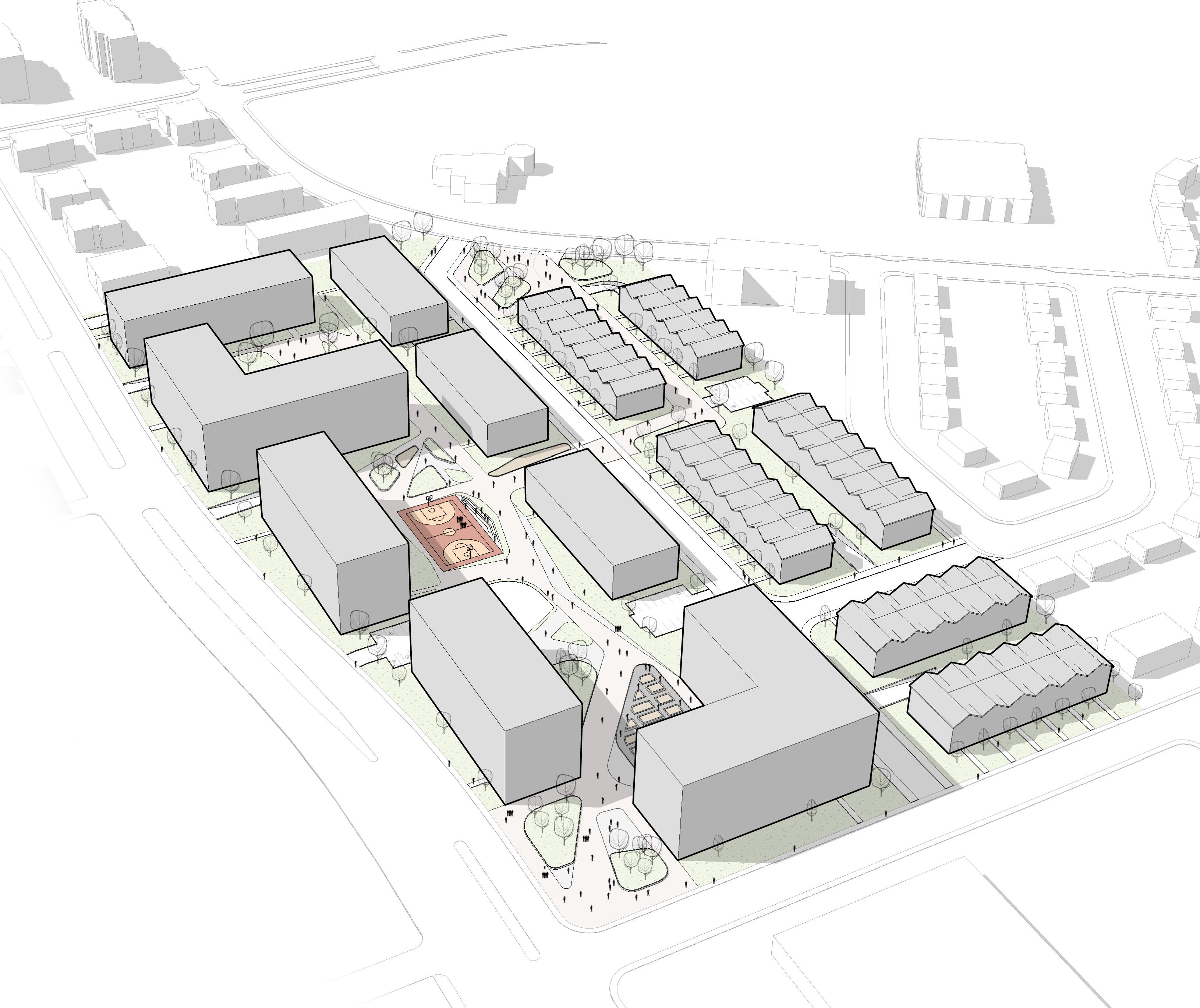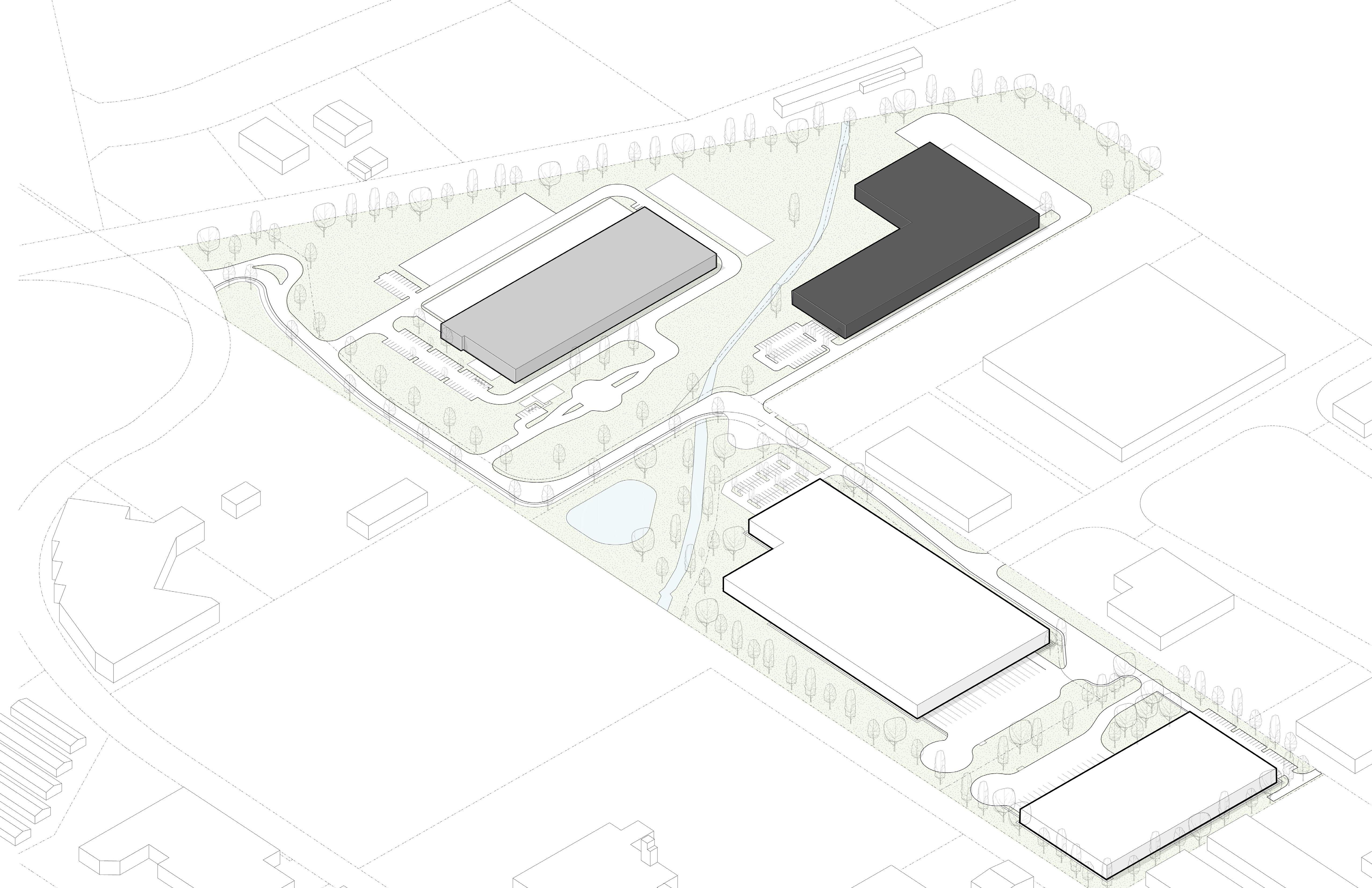 Chaque bâtiment a une densité propre et une typologie influencée par son environnement urbain. Un couvert végétal mature caractérise le site existant et permet de créer une zone tampon autour du projet.