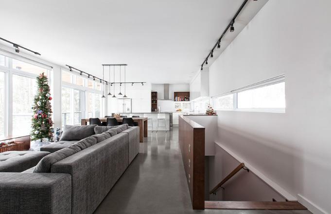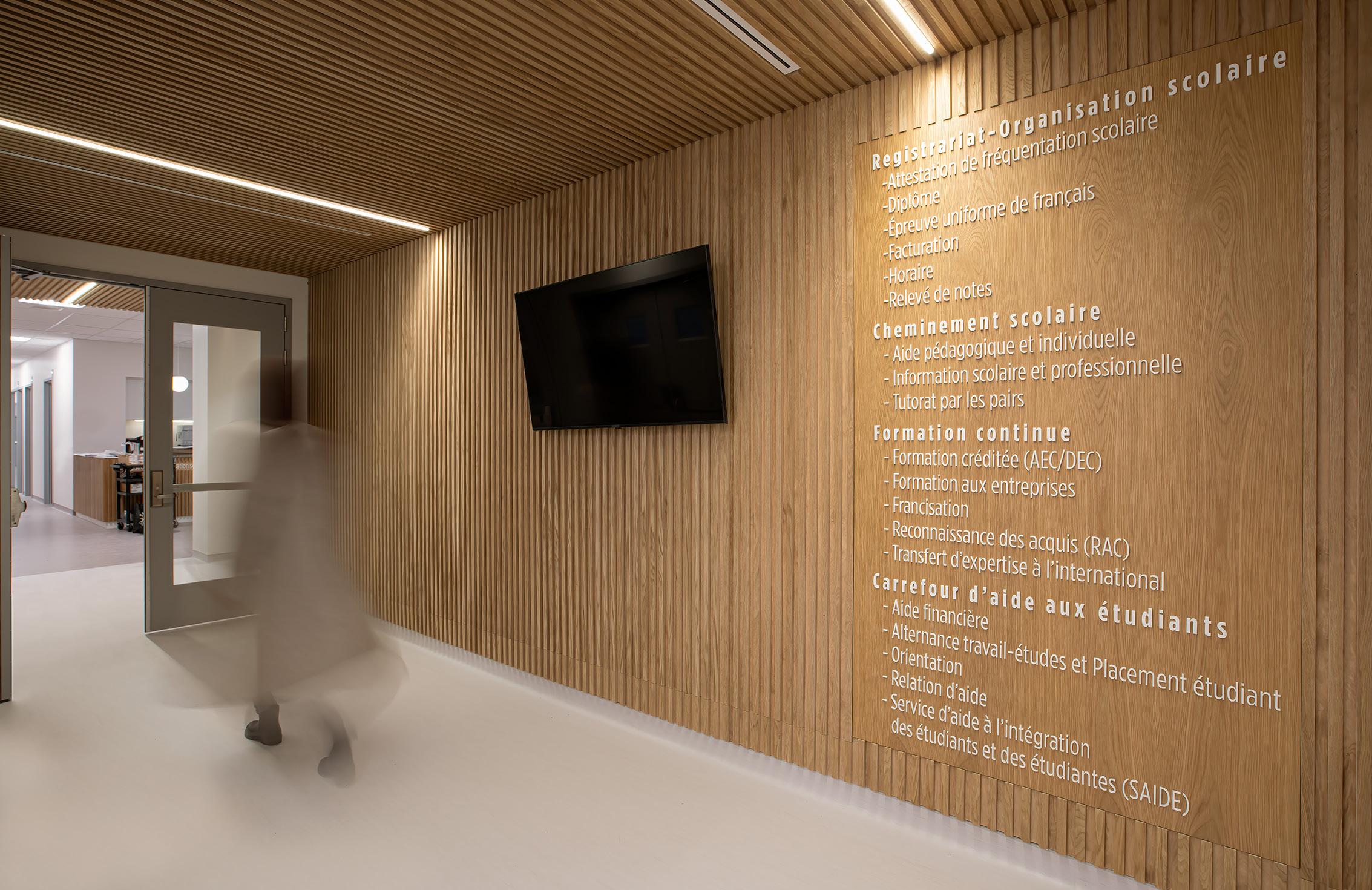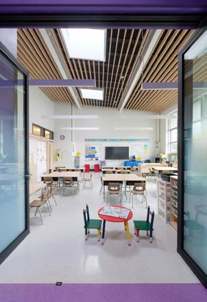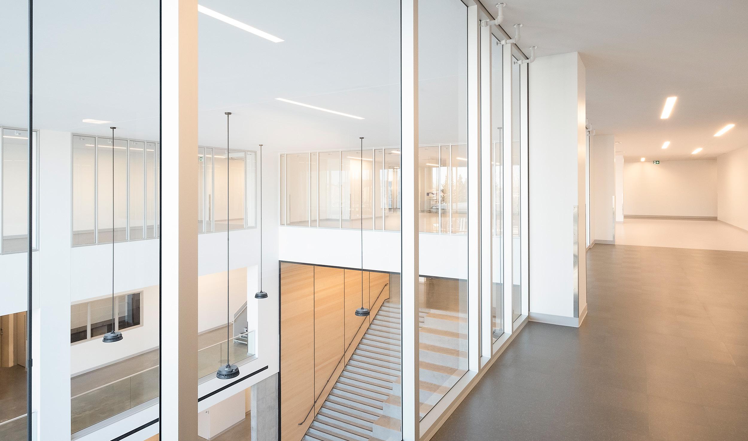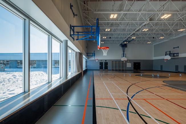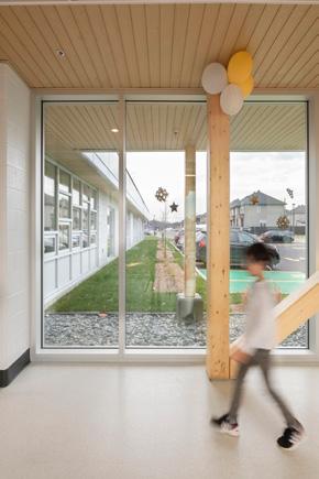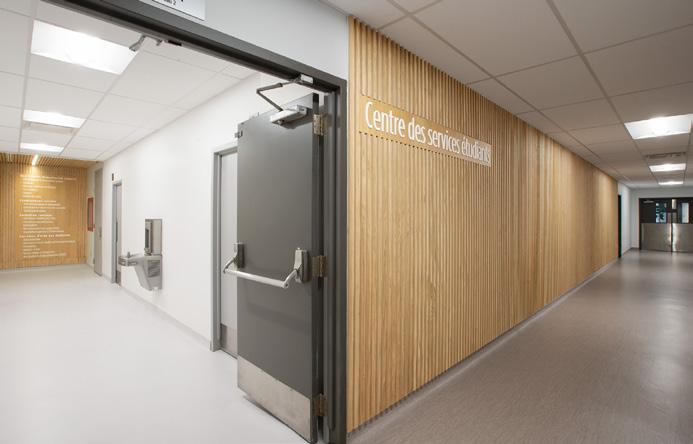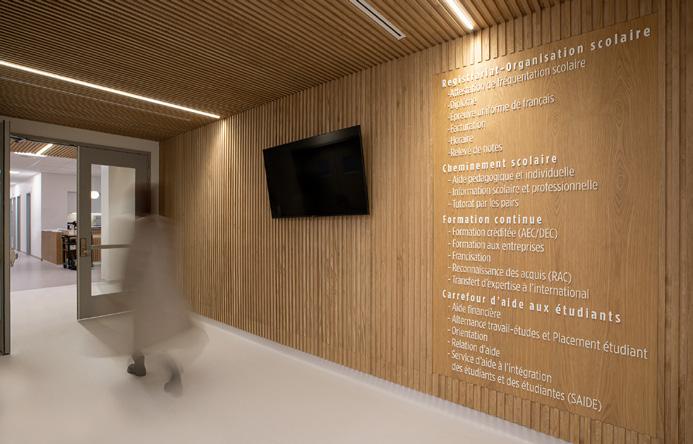 Des rampes-passerelles, un escalier-gradins au cœur de la vie scolaire et des coursives à divers niveaux ponctuent ce noyau de sous-espaces favorisant l’appropriation de l’environnement, rappelant les plateaux de Rimouski.