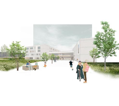 Les espaces extérieurs, les cours, les potagers, le verger, les toitsterrasses, prennent plusieurs formes et sont distribuées tout autour de l’école, en communion avec la nature et dans un objectif d’associer aux espaces intérieurs une extension extérieure qui favorise la diversité, l’alimentation locale et les activités en plein air.