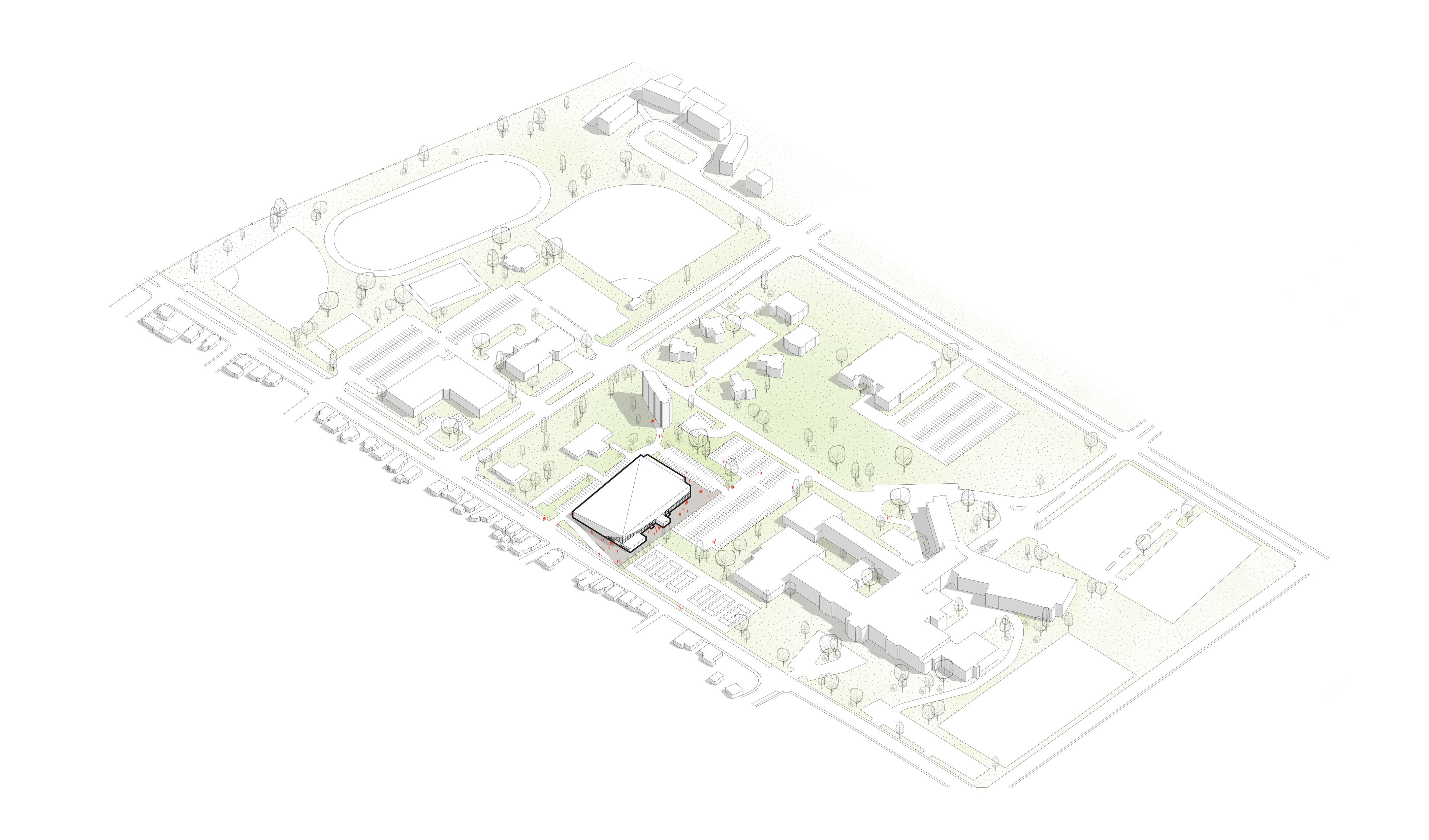 Le site favorise naturellement un bâtiment de forme allongé, permettant de distribuer judicieusement les deux programmes principaux du concours, soit la bibliothèque ainsi que la salle communautaire, de chaque côté d’un espace central. Ainsi répartis autour de cet espace, les nombreux programmes dispensés par le bâtiment seront fonctionnels et mis en relation par un équilibre visuel engageant.
