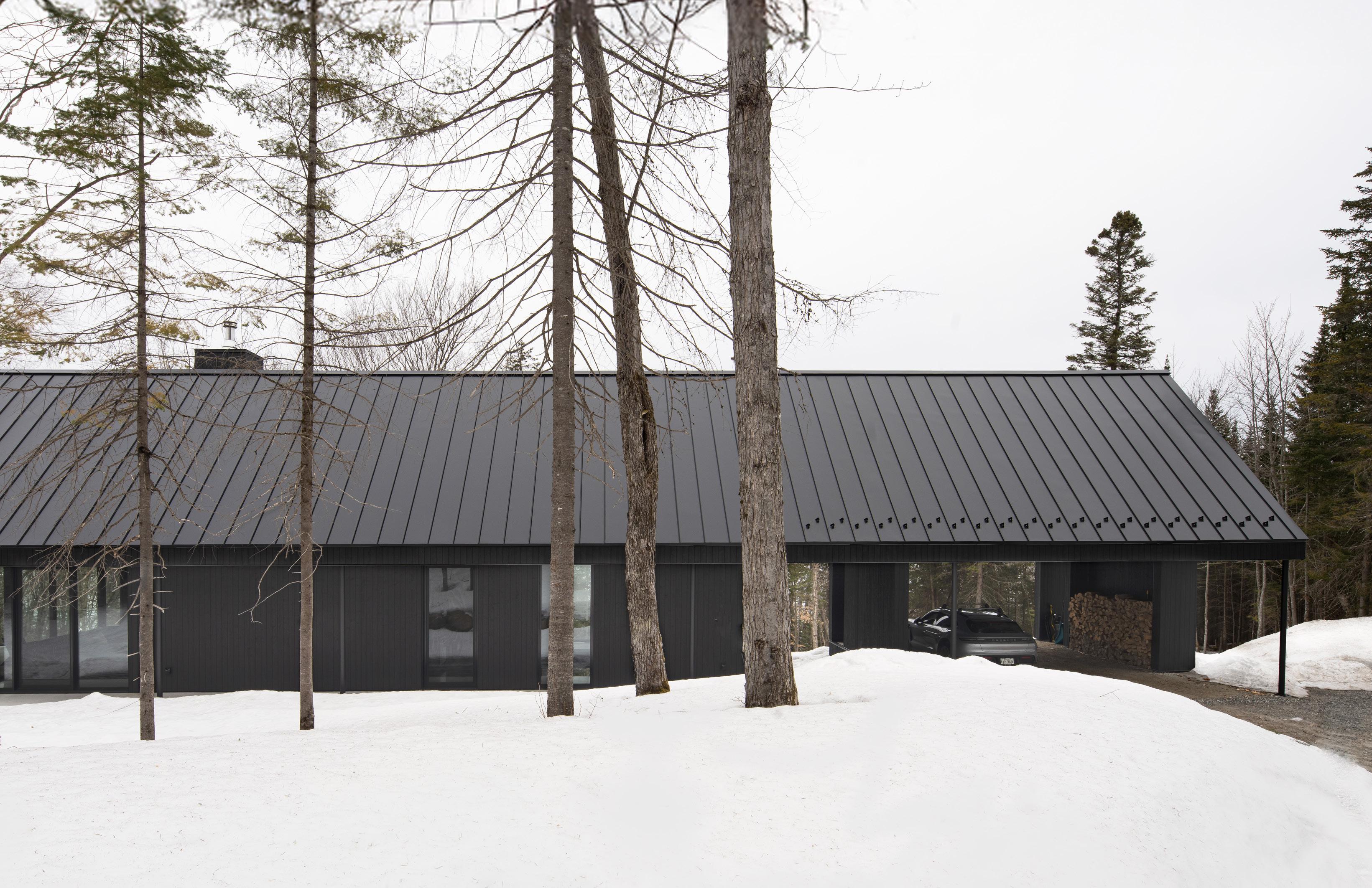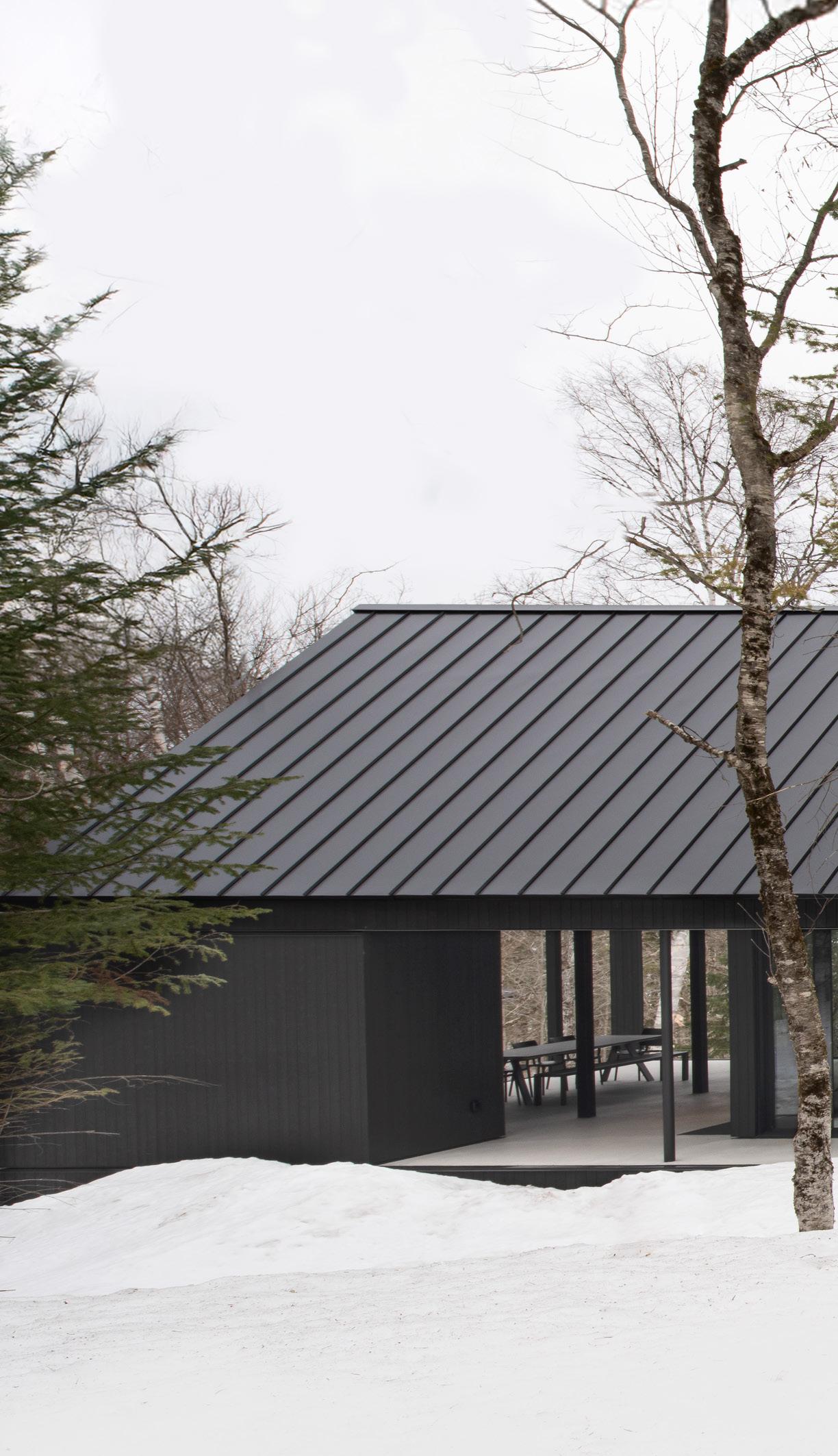 Le bâtiment se déploie en cinq rhizomes ou volumes distincts, tous ramifiés et interreliés. Ce choix conceptuel morcelle les volumes et formalise une bibliothèque qui s’intègre bien à l’échelle de la domesticité que l’on retrouve dans le secteur. Le travail de toitures expressives de formes coniques est inspiré de la forêt de conifères adjacente. La portion avant du bâtiment comprend le programme culturel et communautaire, soit le volume de création et de la salle polyvalente qui sont volontairement positionnés à proximité de l’entrée pour faciliter la gestion des usagers. À l’arrière du bâtiment sont aménagés deux volumes de bibliothèque pour les adultes, adolescents et enfants. Ce positionnement a été privilégié pour sa proximité à la forêt et son caractère immersif. Au centre est aménagé le volume de service qui comprend bureaux, accueil et locaux techniques. Un vaste accès à la cour arrière mène à la terrasse contemplative puis à la clairière de lecture reliée au sentier existant qui permet d’accéder au lac.